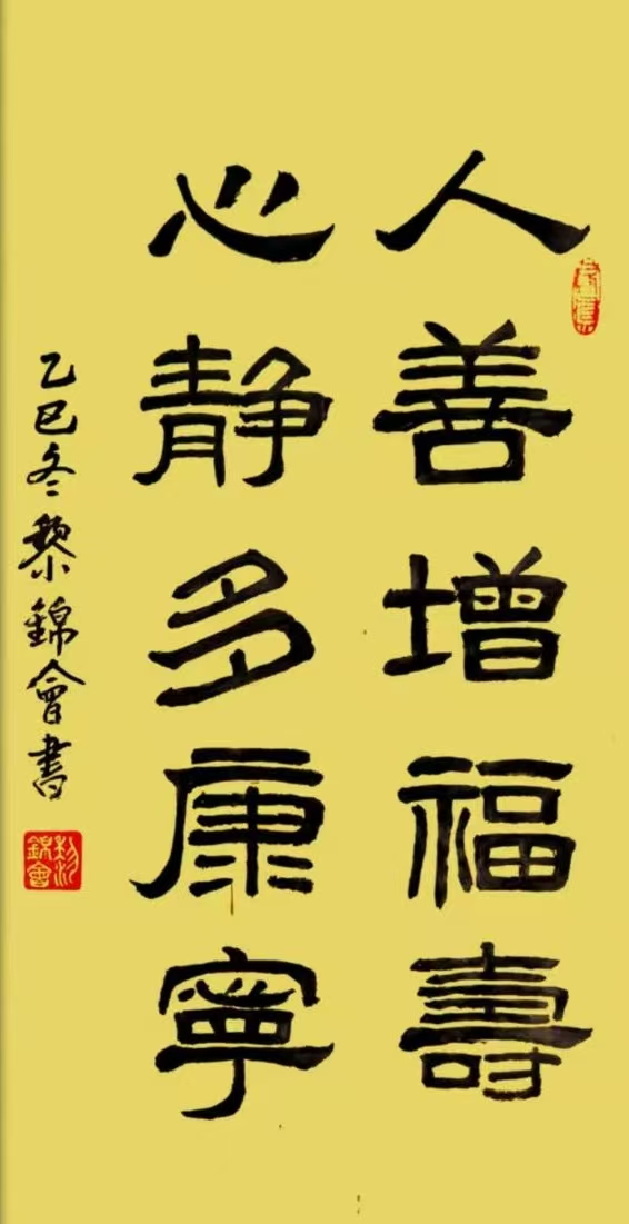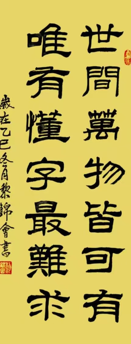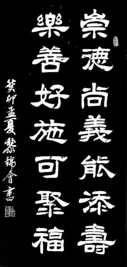 2018年5月考取了中国书画等级教育硬笔书法《高级培训师》并考取全国书法教育《高级讲师》。黎锦会应中央电视台邀请,参加“2021年中国艺术家”新春联欢晚会活动中,经组委会特别评审甄选,被授予:2020年度当代最具影响力艺术名家荣誉称号,同时接受CCTV访谈。隶书作品:“崇德求真至善至强”被中央电视台藏宝天下栏目组收藏。