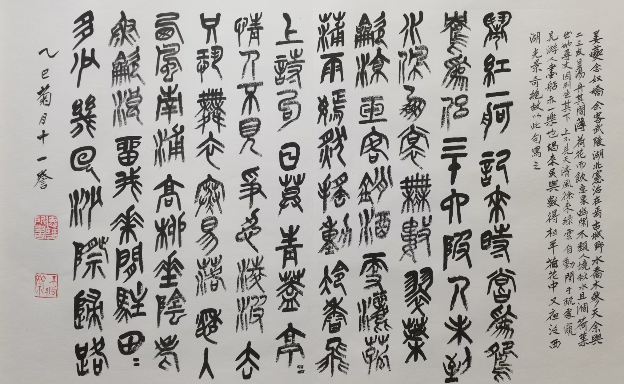 客武陵,湖北宪治在焉。古城野水,乔木参天。余与二三友日荡舟其间,薄荷花而饮,意象幽闲,不类人境。秋水且涸,荷叶出地寻丈,因列坐其下,上不见日,清风徐来,绿云自动。间于疏处窥见游人画船,亦一乐也。朅来吴兴,数得相羊荷花中。又夜泛西湖,光景奇绝。故以此句写之。