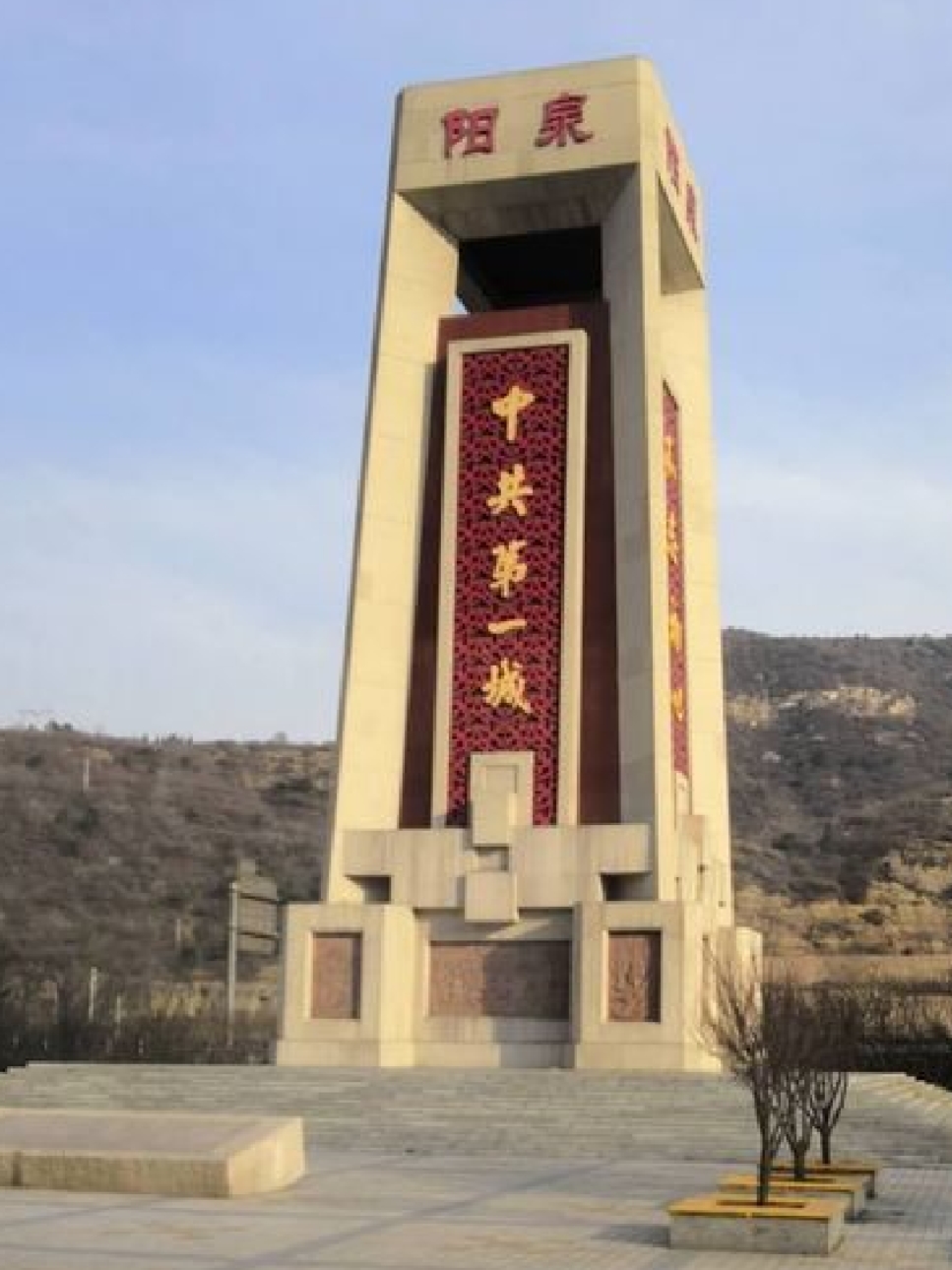这座雕塑位于山西省阳泉市城区泉中路1号,太旧高速公路阳泉西出入口处。雕塑呈方锥体,总高33.99米,外饰为浅色花岗岩。雕塑主体分为三部分:上部四面刻有“阳泉”字样。中部为主体部分,北、南正立面书有“中共第一城”五个大字,两个侧面分别题写“山连四海”、“地藏大气”的阳泉精神。下部由12块浮雕组成,分为“阳泉解放”、“争矿运动”、“百团大战”、“山城新貌”四个主题。这座雕塑是该市别具特色的城市名片。它记录了阳泉市在中国共产党领导下的光辉历程,展现了阳泉人民在革命和建设时期的英勇奋斗精神。对阳泉是“中共创建第一城”一说我存疑。瑞金曾是中华苏维埃政府所在地,延安曾是陕甘宁边区中央所在地。我网上查有关阳泉是“中共创建第一城”的资料,尽管说的有鼻子有眼,但我不以为然。