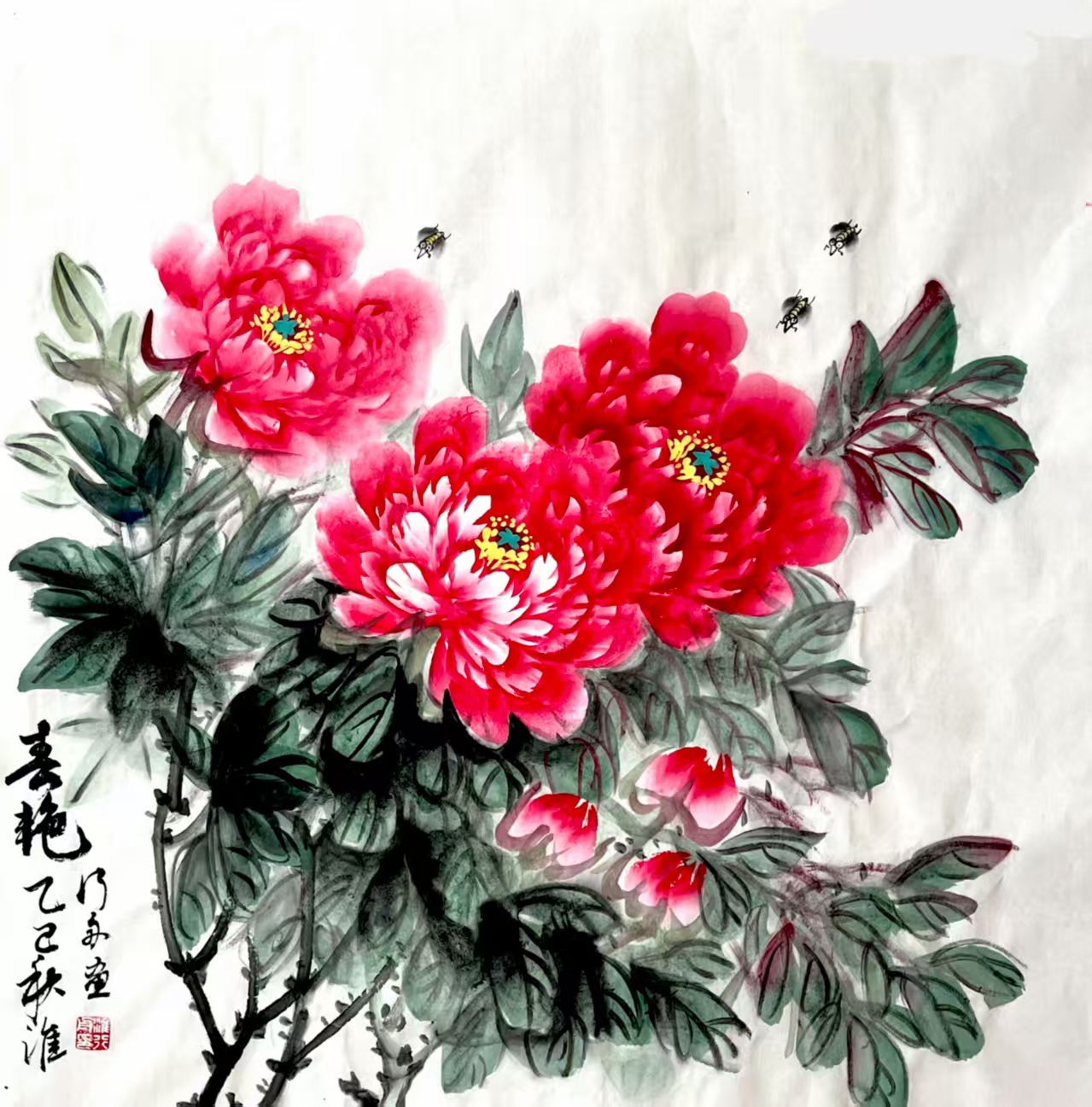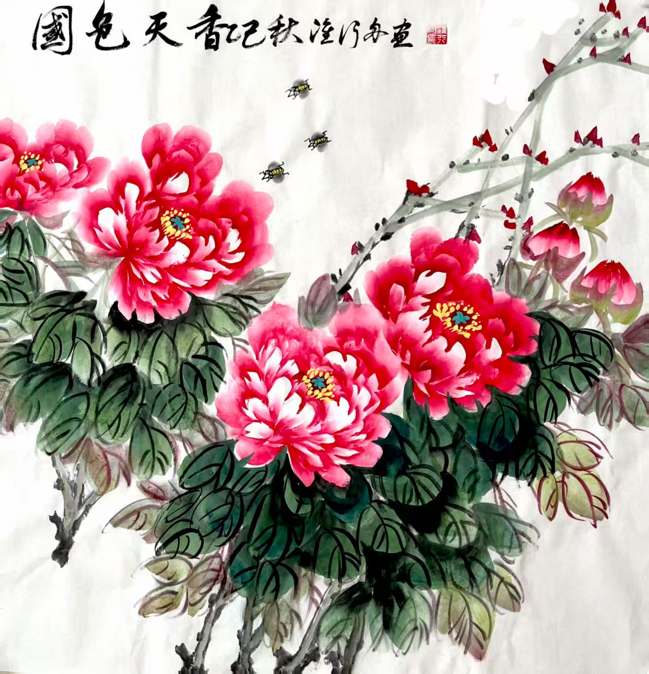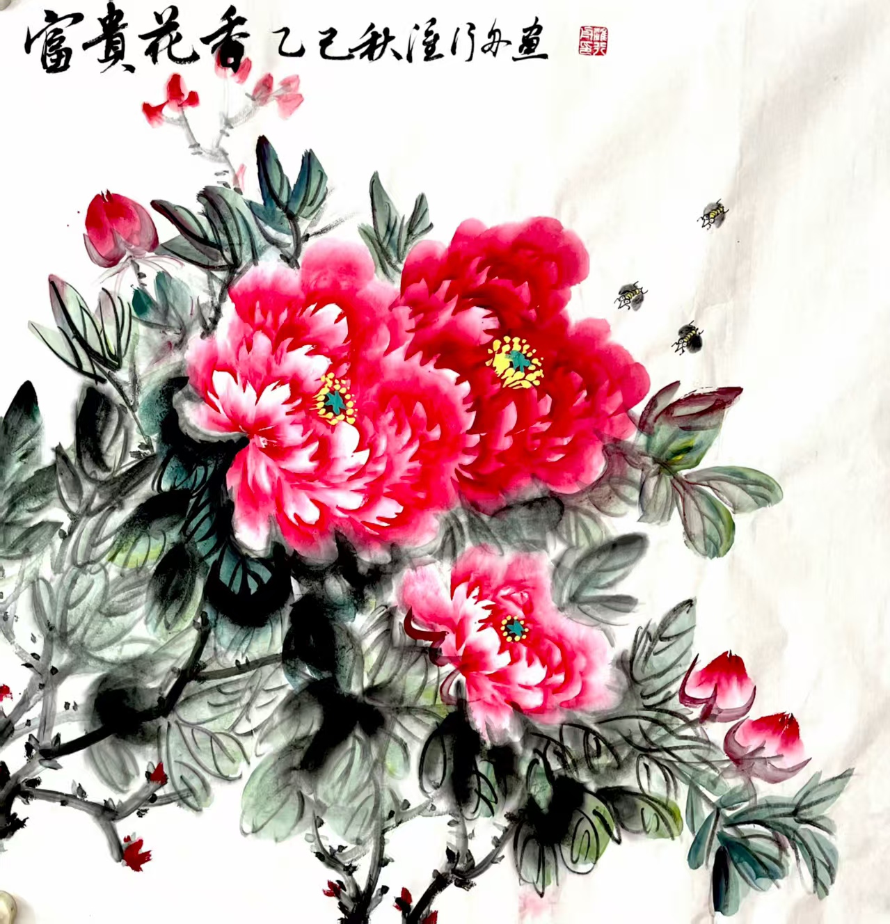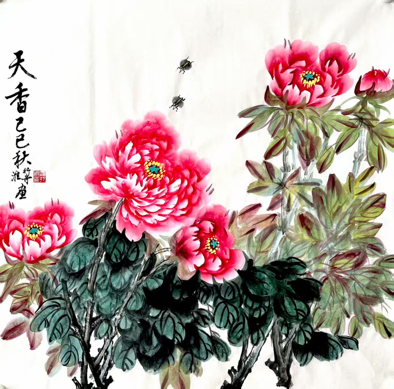 国画牡丹斗方《富贵花香》69x69cm 2025