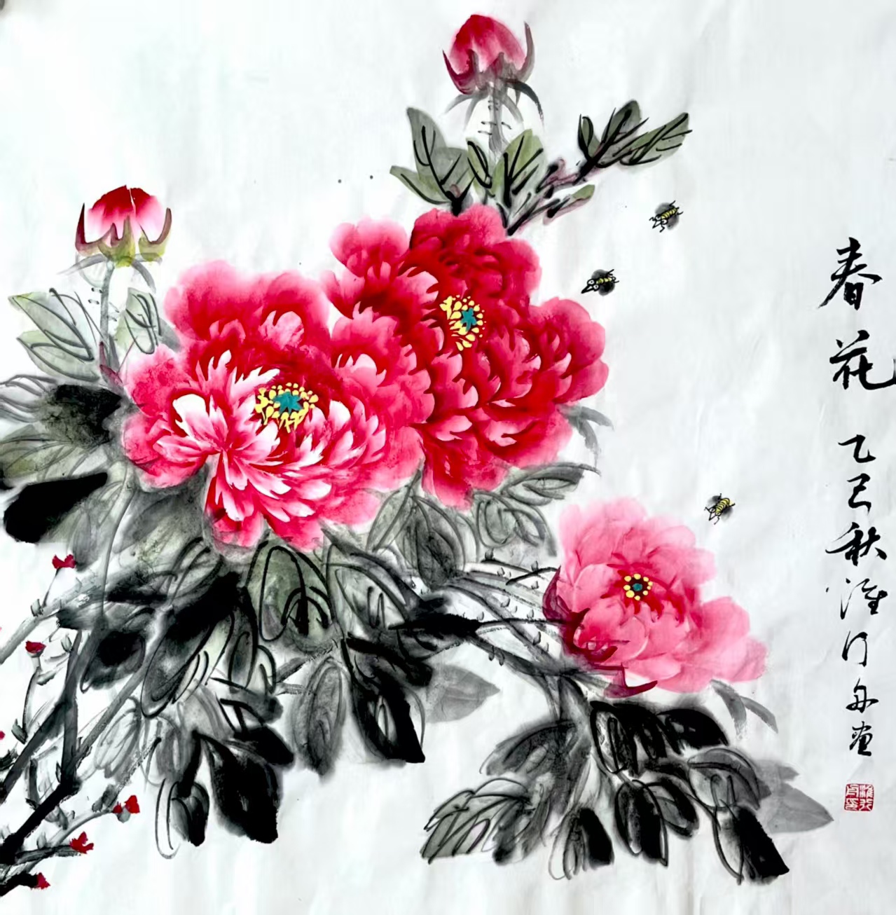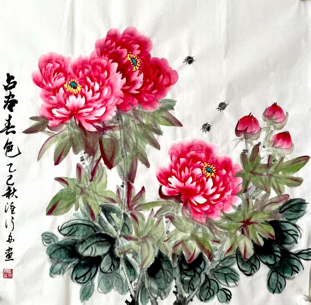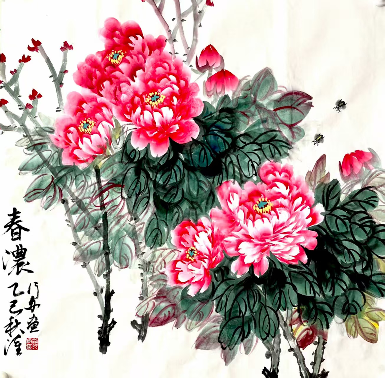 国画牡丹斗方《占尽春色》69x69cm 2025