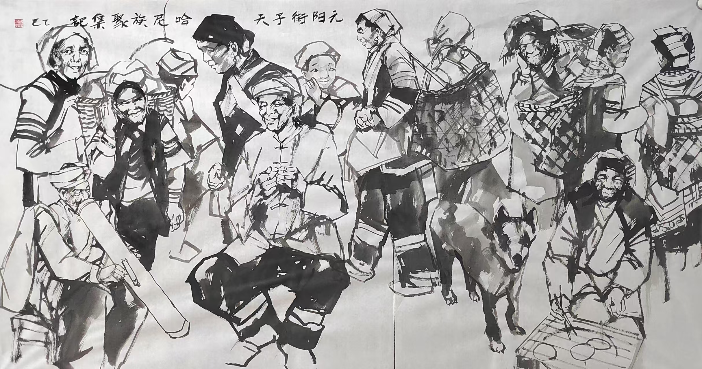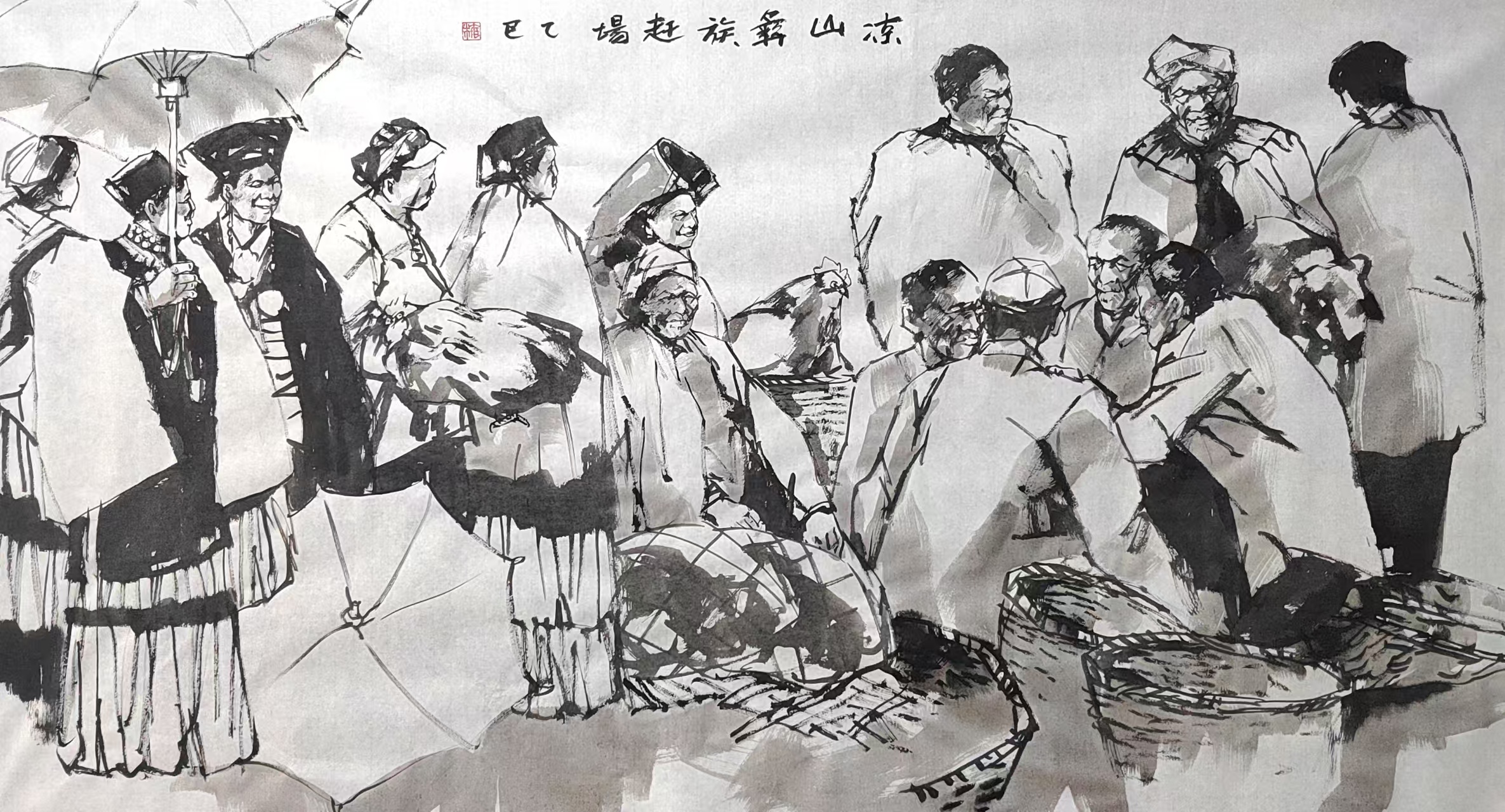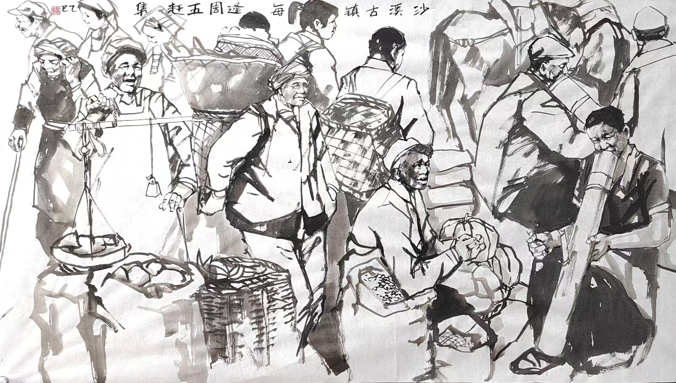 水墨速写《沙溪古镇集市》96x180cm 2025
