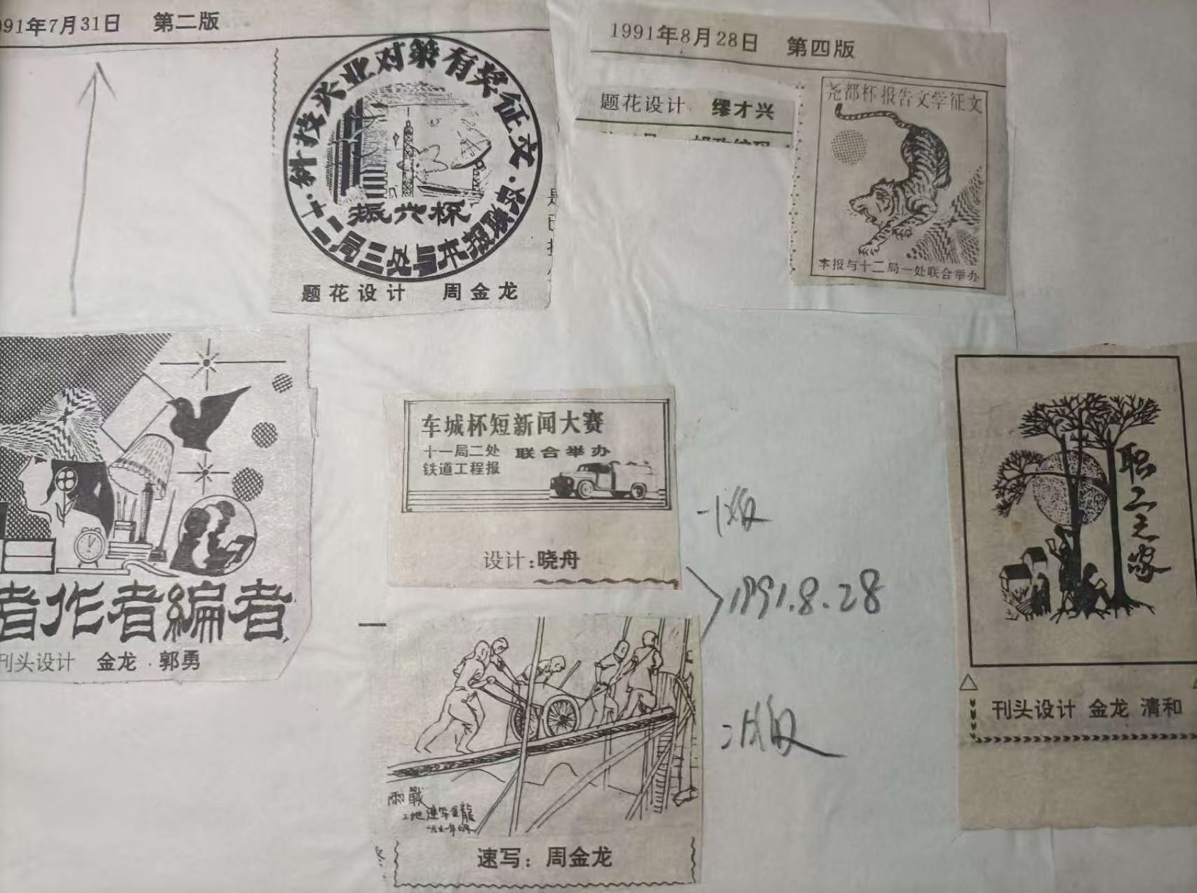 三十年前,年轻勤奋。我真正做到了“勤动脑、勤动手、勤动腿”三勤,成为一名年轻宣传工作者应该有的样子。每天除了写作就是画画,办公桌上摆满了新闻稿纸、信封、白纸、尺子、圆规、剪刀、钢笔、黑色墨汁等。那时的《铁道工程报》二、三、四版,以“万水千山”、“文化宫”、“青年之友”、“多种经营”、“读者作者编者”、“科技兴业”、“职工之家”、“法制园地”等栏目面向读者。这些栏目的“刊头画”,相当一部分由我设计创作发表于各个版面。