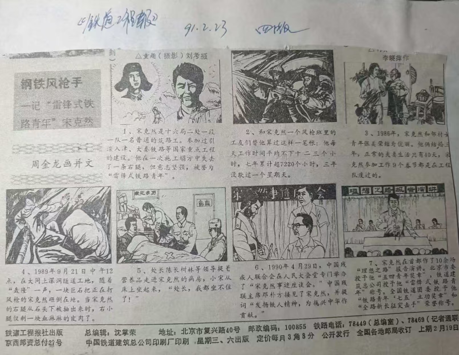 为此,我还写了一篇“浅谈刊头画”文章,发表于1991年8月10日《铁道工程报》四版。还有连环画“钢铁风抢手”——记“雷锋式铁路青年”宋克然。发表于1991年2月23日《铁道工程报》四版。
