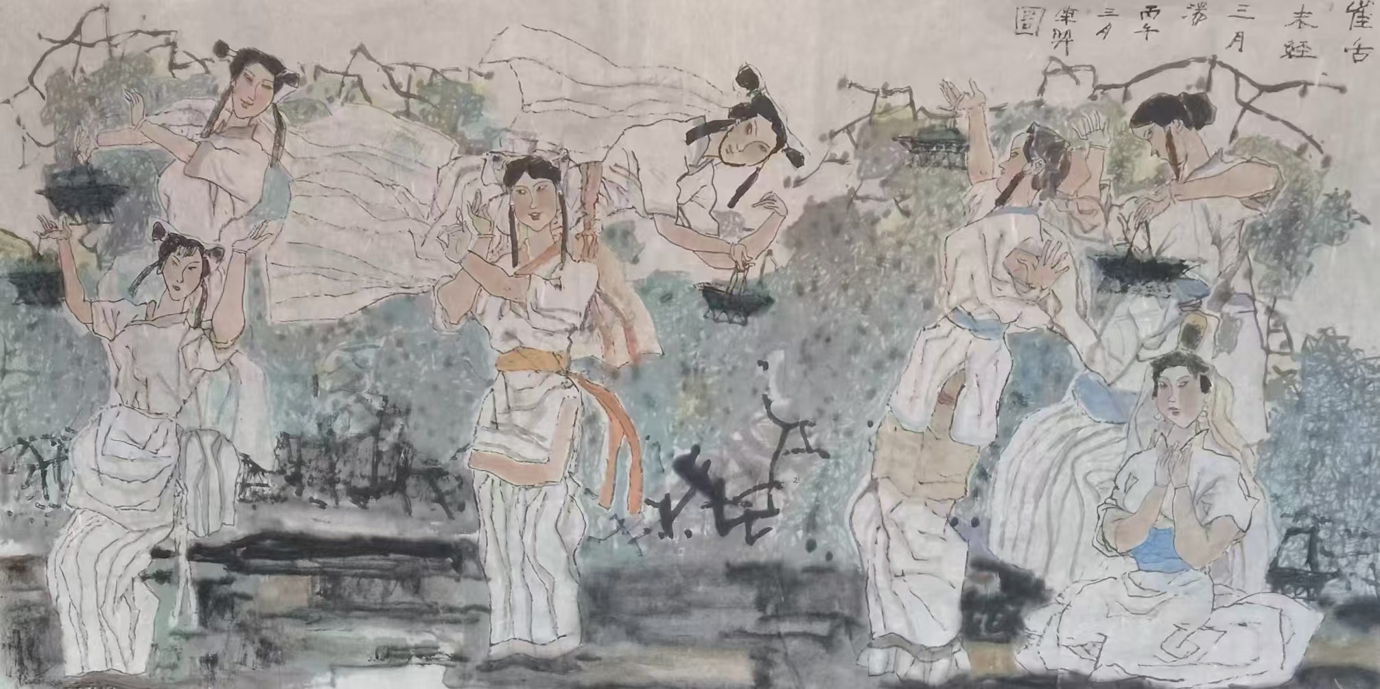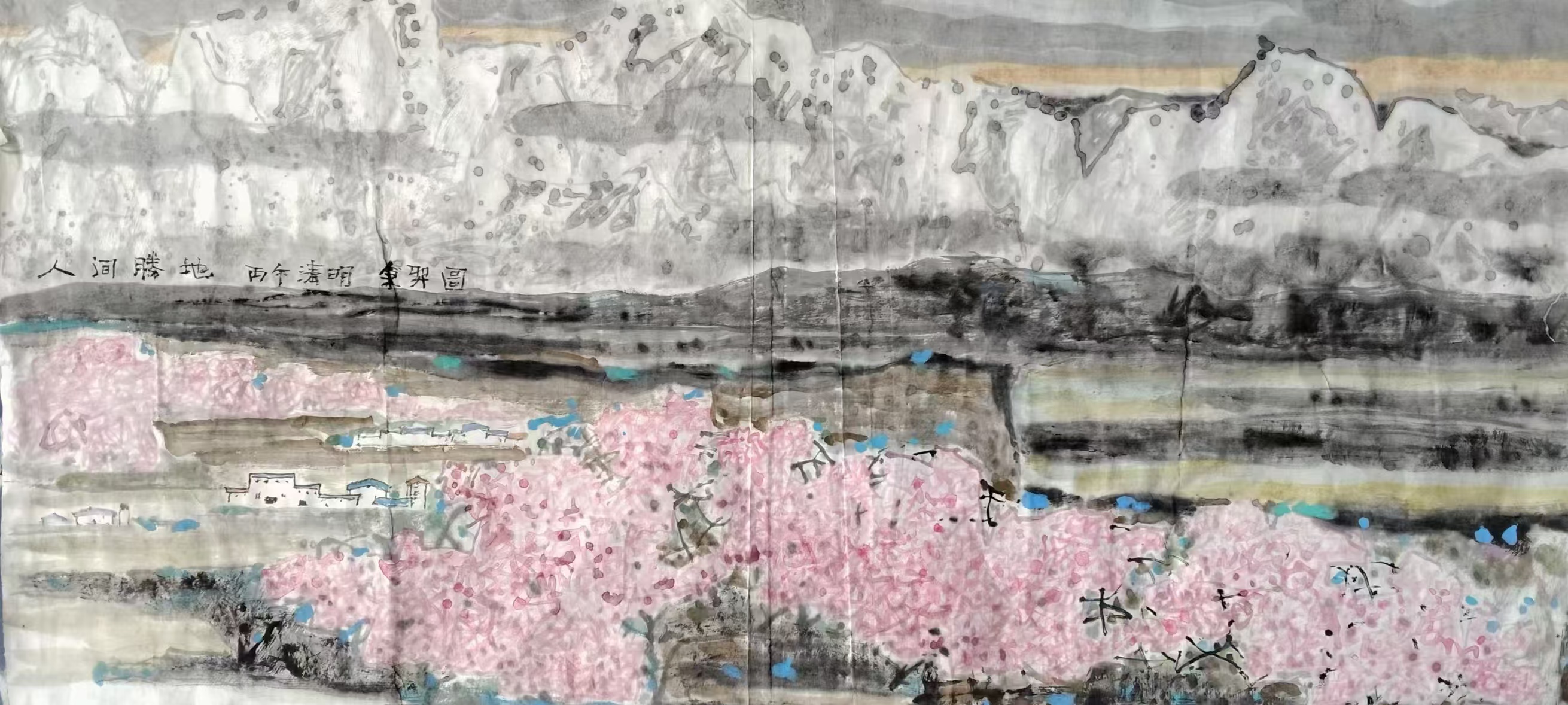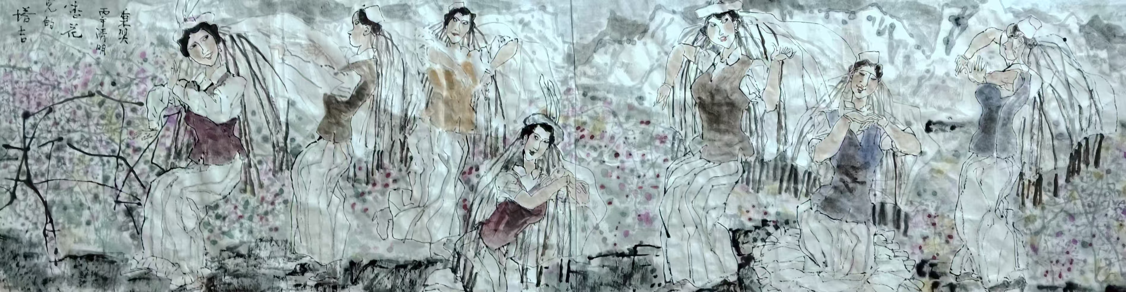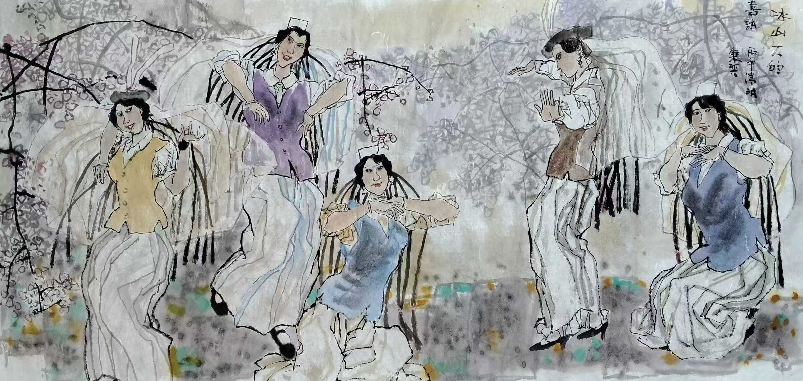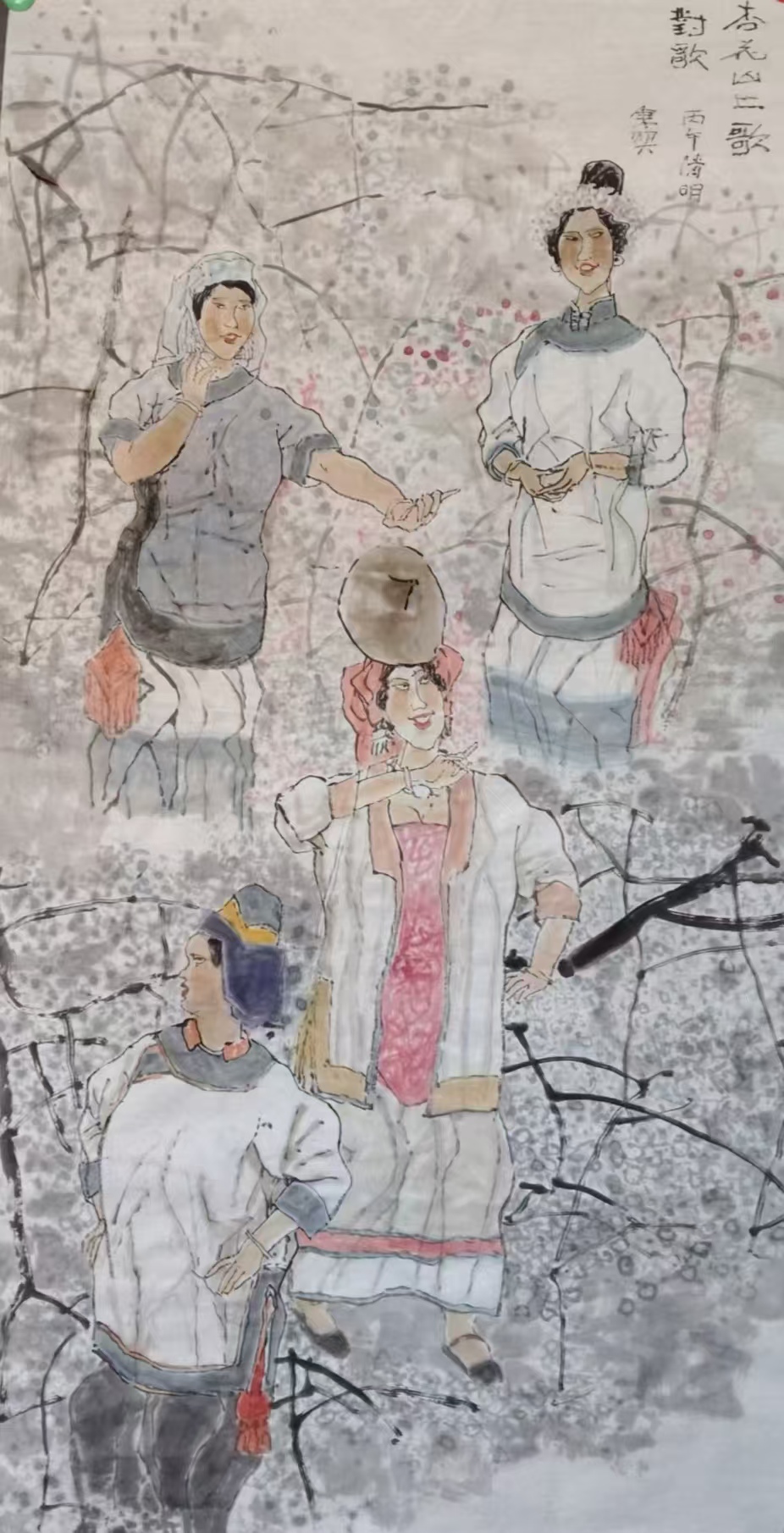 写意国画《杏花山上歌对歌》138x69cm 2026