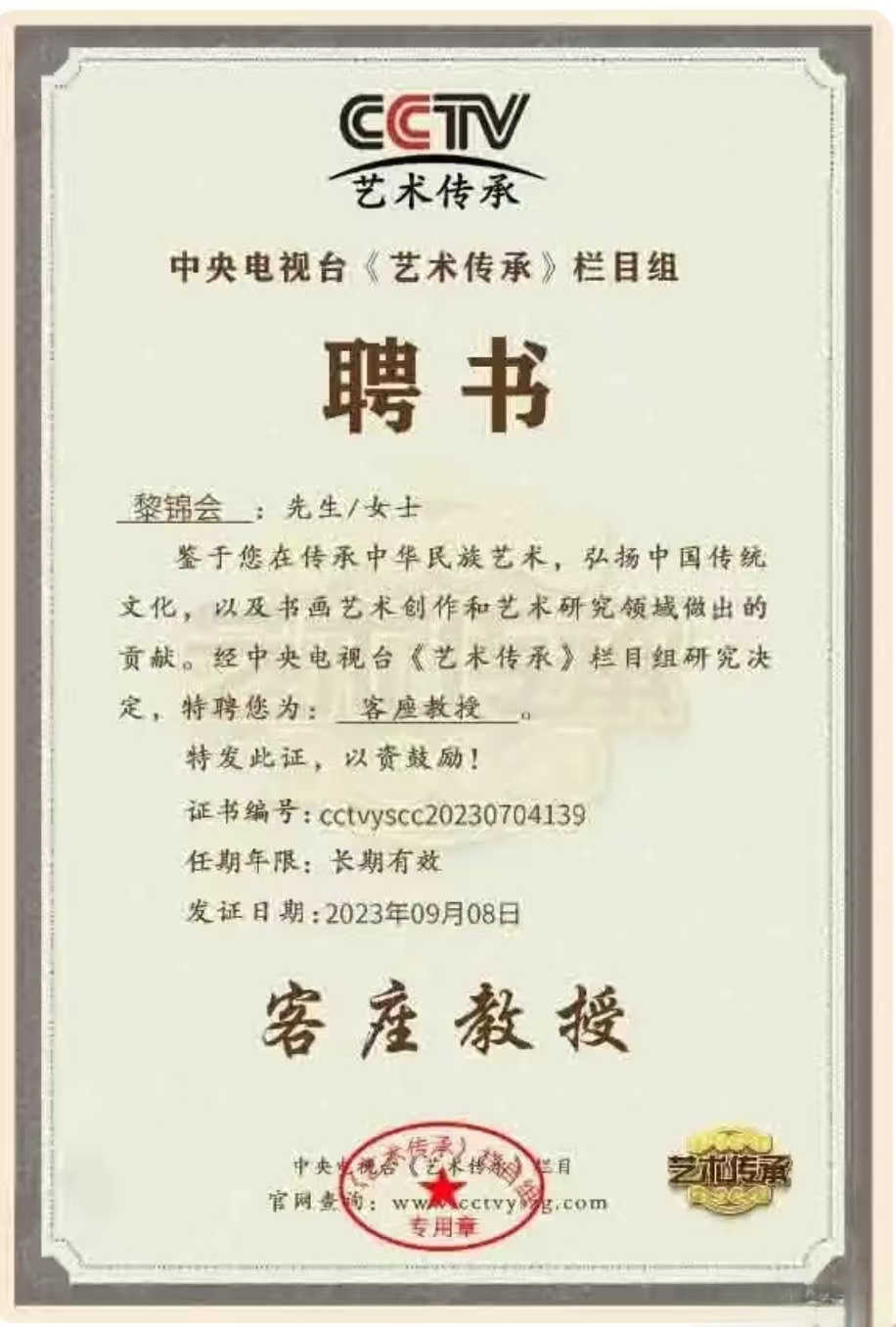 2018年5月考取了中国书画等级教育硬笔书法《高级培训师》并考取全国书法教育《高级讲师》。黎锦会应中央电视台邀请,参加“2021年中国艺术家”新春联欢晚会活动中,经组委会特别评审甄选,被授予:2020年度当代最具影响力艺术名家荣誉称号,同时接受CCTV访谈。隶书作品:“崇德求真至善至强”被中央电视台藏宝天下栏目组收藏。