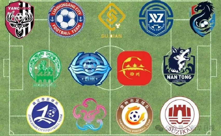 附江苏13支足球队的队徽标志。上排右1是淮安队队徽浪里马。