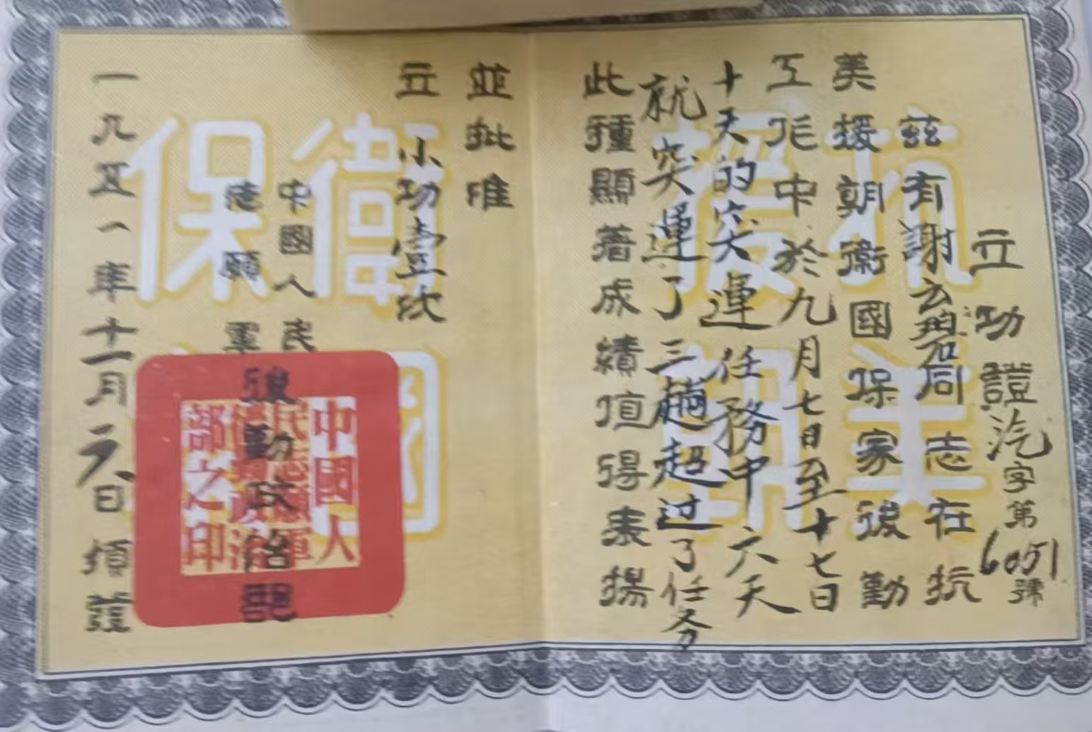 1951年9月7日至17日,在上级下达十天火线突击抢运军需后勤保障物资的特殊任务中,冒着美帝飞机的狂轰滥炸,仅用6天在生死线上往返三趟,提前圆满地将急需军用物资送达前线,受到志愿军后勤部政治部记小功一次褒奖。