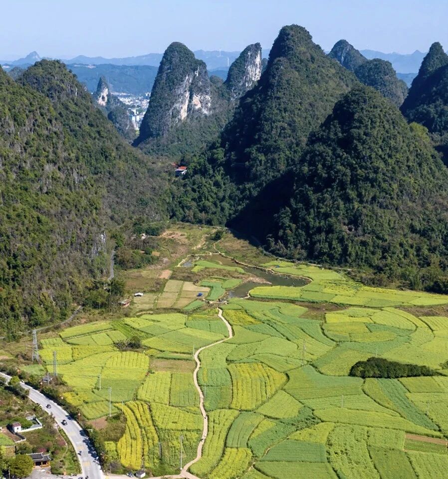 风光好,古木翠参天。花岭梯田添锦绣,粉墙青瓦罩炊烟。檐顶晒秋繁。