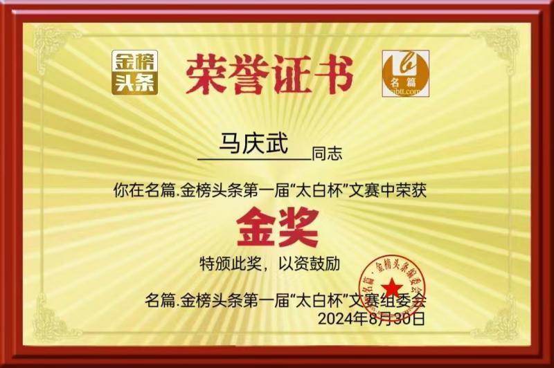 马庆武,男,党员,中央党校大专学历。辽宁省喀左县出生,8岁迁居黑龙江省庆安县,19岁应征入伍,现住河北省涿州市。1972年12月入伍,先后在铁道兵14师、8师服役。提干后,历任营部书记、团参谋、副股长。1984年元月兵改工后,历任中铁18局4处科长、1处工会主席、电务处党委书记、1公司党委书记、董事长等职。退休后,热爱诗词写作。其作品大多发表在《铁道兵文化网》、《赣雩文艺》、《新京都文艺》、《梅兰文学》、《锦湖诗社》、《今日头条》、《新华网客户端》等网络平台。现为:中华诗词学会会员、黑龙江省诗词学会会员、铁流诗社会员、兴安塔诗社会员。《梅兰文学》签约诗人。荣获 名篇 金榜头条平台《创新有为诗人奖》,2024年第一届“太白杯”诗文赛中荣获金奖。