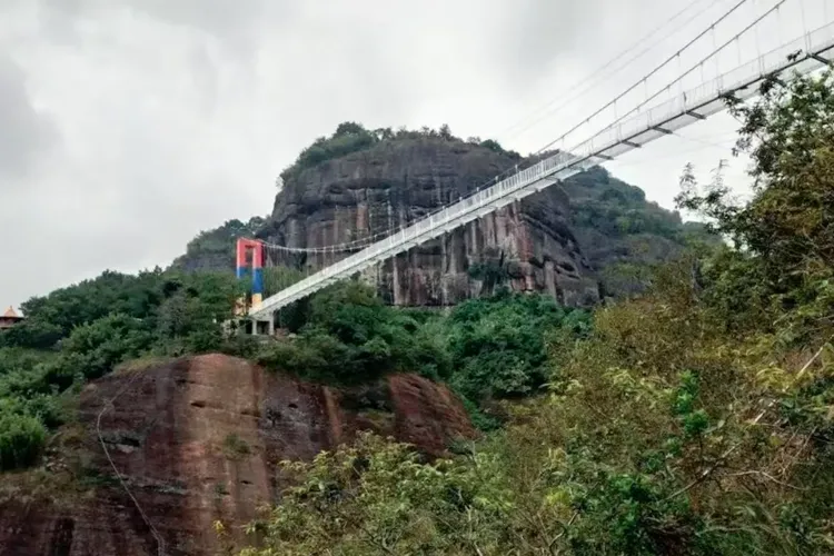 如浪峰峦卷碧烟,吊桥梯道嶂中悬。
