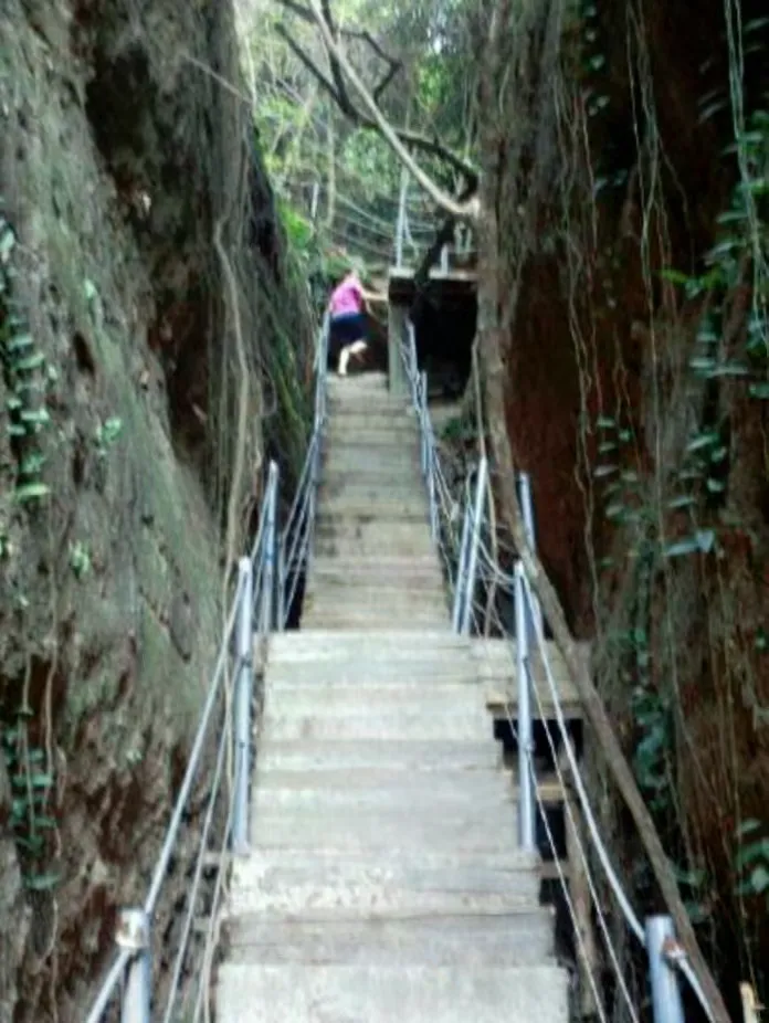 如画峰林萦紫烟,回廊栈道壁间连。