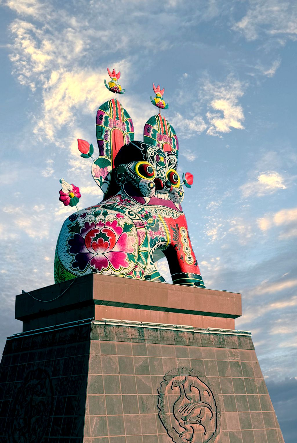 凤翔区的七路公交车直达六营民俗文化村,老远就看见耸立在泥塑广场的坐虎和卧羊造型。坐虎是凤翔泥塑博物馆的镇馆之宝和传家之宝,也是最具代表性的作品之一。它前腿立后腿坐,形态极度概括,但不失虎的神韵,面部紧凑,耳朵夸大,显其威严,躯体饰以莲花、牡丹等纹饰,浓艳大方。卧羊汲取了古代石刻、年画、剪纸等艺术中的纹饰,展现了凤翔泥塑独特的艺术魅力,富有观赏性,2003年卧羊成为羊年生肖邮票主图案。