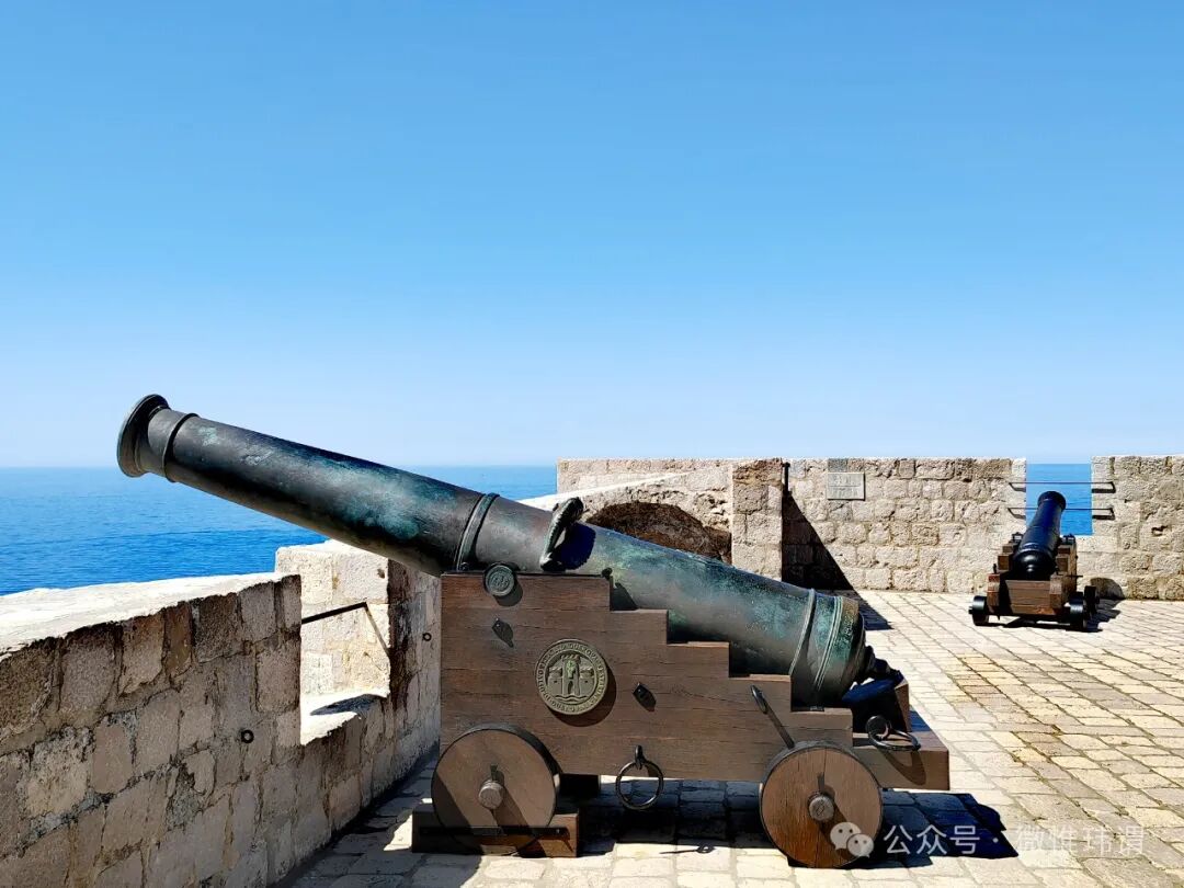 城墙上保留着古炮,靠陆地一侧砌得很厚,可容数人并排,靠海的一边很薄,仅容一人通过,这是冷兵器时期抵御入侵的需要,红瓦和城墙之外就是湛蓝的亚得里亚海。