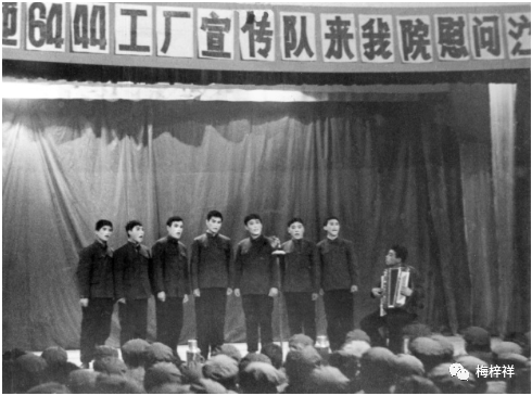 1975年,铁道兵六四四四工厂宣传队到部队医院演出男生小合唱《军工战士学雷锋》《革命热情红似火》黄荣森作词、作曲。黄荣森摄影。