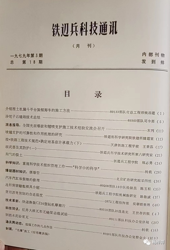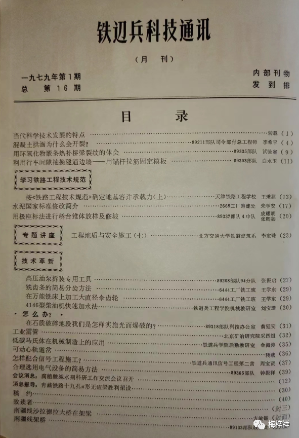 期刊整体内容比较丰富,有比较前沿的科技,北方交大遥感研究室关于遥感技术在铁路地质中的应用,也有接地气的“战士园地”栏目介绍混凝土、内燃机等知识;早年修建成昆铁路莲地隧道施工总结,更有新闻性极强的对越自卫还击战抢修河口大桥的经验;“桥梁施工专题讲座”、“技术革新”是本年度长设栏目。因为是军队期刊,年初铁道兵参加了南疆作战,杂志居安思危地刊发《核武器及其防护》系列知识性文章。