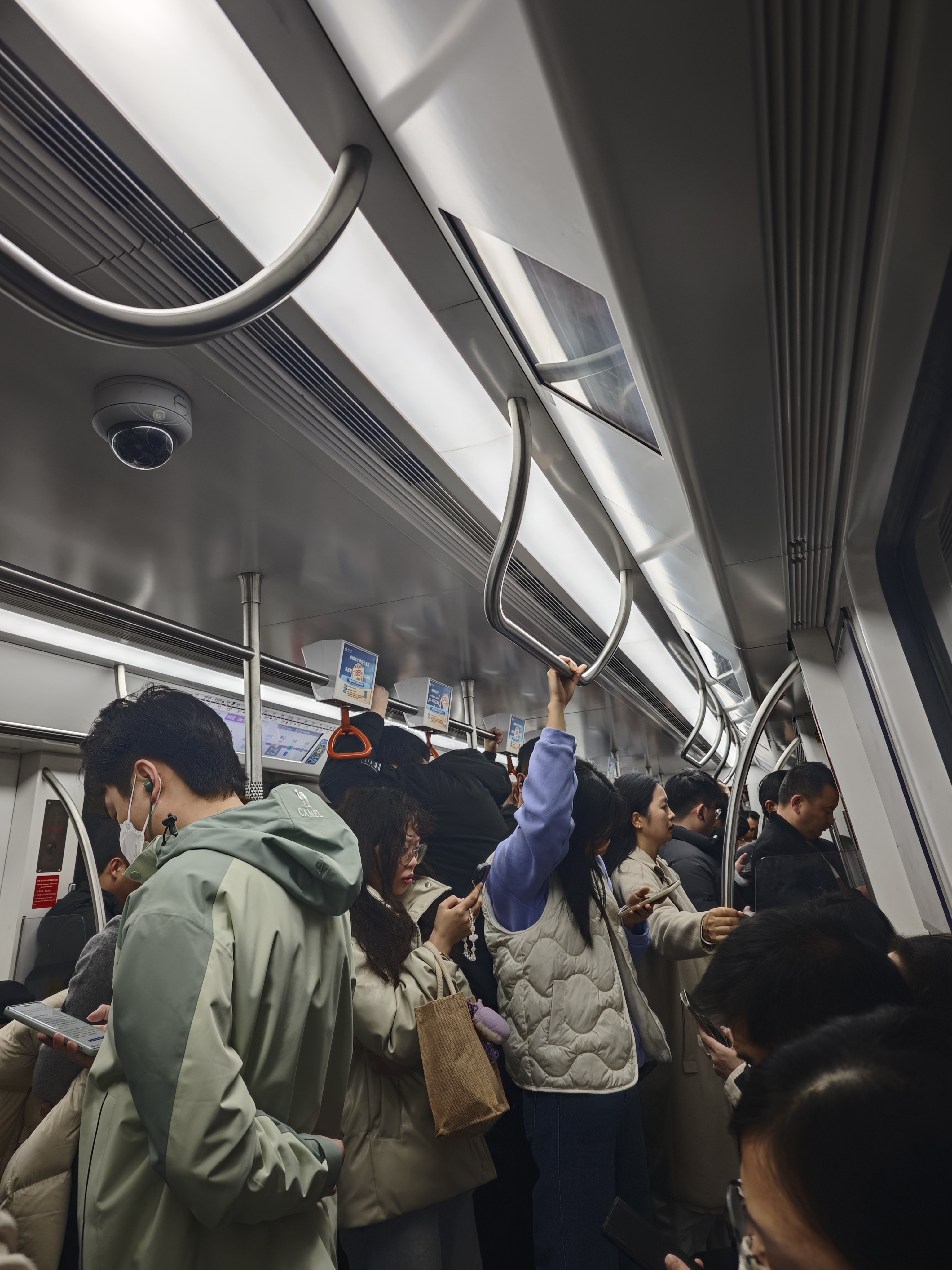 车厢里挤满了人,我俩环顾四周,一个空座也没有,便抓稳扶手站定。列车晃晃悠悠地向前行驶。