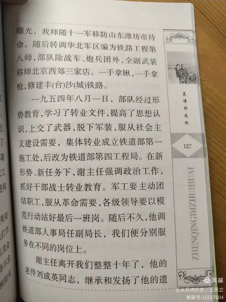 一九五四年八月一日,部队经过形势教育,学习了转业文件,提高了思想认识,上交了武器,脱下军装,服从社会主义建设需要,集体转业成立铁道部第一施工处,后改为铁道部第四工程局。在新形势、新任务下,谢主任强调政治工作,抓好干部战士转业教育。要主动团结职工,服从革命需要,各级领导要以模范行动站好最后一班岗。随后不久,他调铁道部人事局任副局长,我们便分别服务在不同的岗位上。