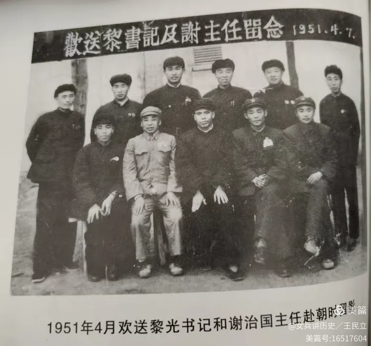 1951年4月,182师出川入朝,同志们欢送师政委兼剑阁地委书记黎光和政治部主任谢治国赴朝留影。