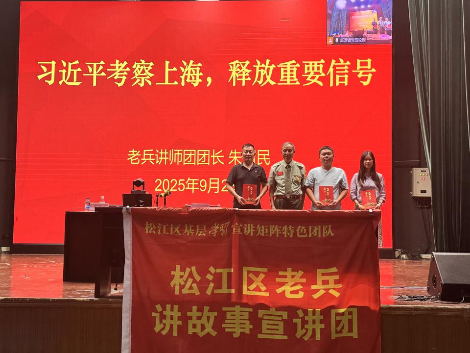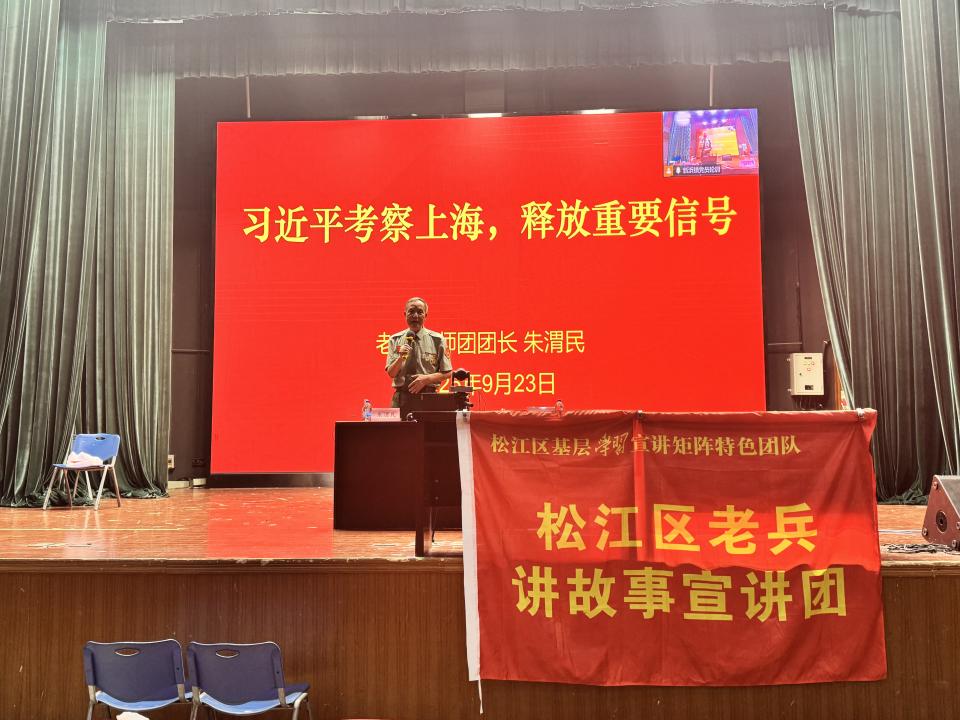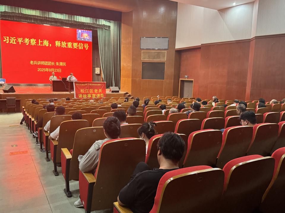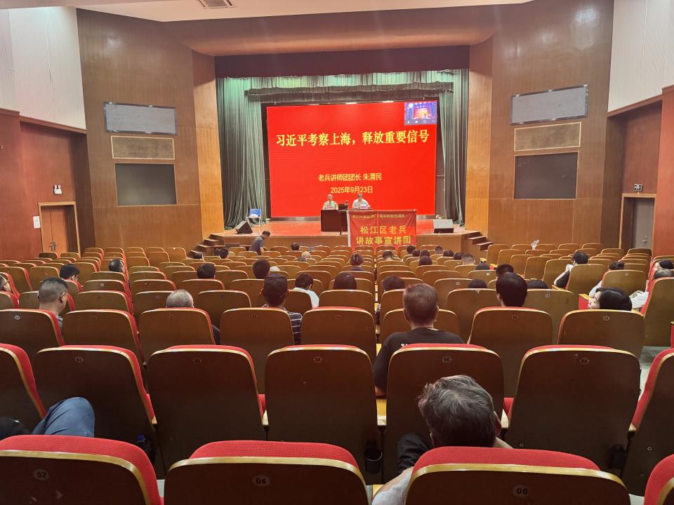 2025年9月23日上午,松江老兵讲故事宣讲团名誉团长朱渭民,应邀到新浜镇社区文化中心宣讲红色故事《习近平总书记考察上海,释放重要信号》。听众来自新浜镇鲁星村和文华村党总支机关企事业单位代表约50余人,由于会场太大,人少有点空落,但这不影响老兵的激情宣讲。朱老师首先表明,我今天是带着学习的愿望来新浜镇讲故事,因为这里拥有非常深厚的红色文化资源。早在上世纪三十年代,老一辈无产阶级革命家陈云同志曾多次来到新浜,宣传革命理论、播下红色火种,并发动和领导了著名的枫泾暴动,指挥部就设立在新浜镇大方庵里。我有一位战友叫曹栋,是土生土长的新浜人,他曾经给我讲过父亲曹小毛的故事,这位曹老前辈是中共地下党员,农会骨干,参加了枫泾暴动,新浜镇志中有他的事迹介召。我一直在想,老兵宣讲团每年宣讲场次很多,今年有望超过300场,目前开讲的红色故事有60余则,唯独没有讲过枫泾暴动等松江本地的红色故事,确实有些欠缺。我今天怀着学习的愿望来到新浜,希望在新浜镇党建部门的关心支持下,团队尽快挖掘整理出新浜红色文化中最精采的篇章,以讲故事方式向群众作广泛宣传,这虽然是个设想,但我们一定会付诸行动。