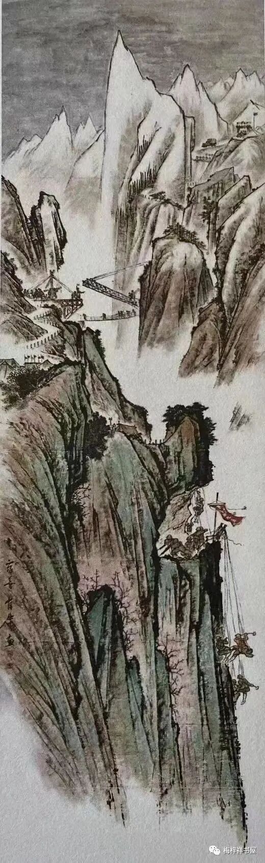 两个人紧贴着石崖,赤脚踏着光滑的石壁,像荡秋千那样,慢慢地滑到“天桥”上。白云在身边飞驰,苍鹰在脚下盘旋,江水在崖下吼叫,就在这千古石峡中,响起了“叮当!叮当!” 的铁锤声。在绝壁上开辟了第一个立脚点,又由点到线打开一段三寸宽、一丈多长的通道。然后十一位战士把身子悬在半空,相互竞赛打眼爆破。一个多月里,战土们天天这样飞崖走壁,艰苦劳动,终于劈开了绝壁,打出了路基。