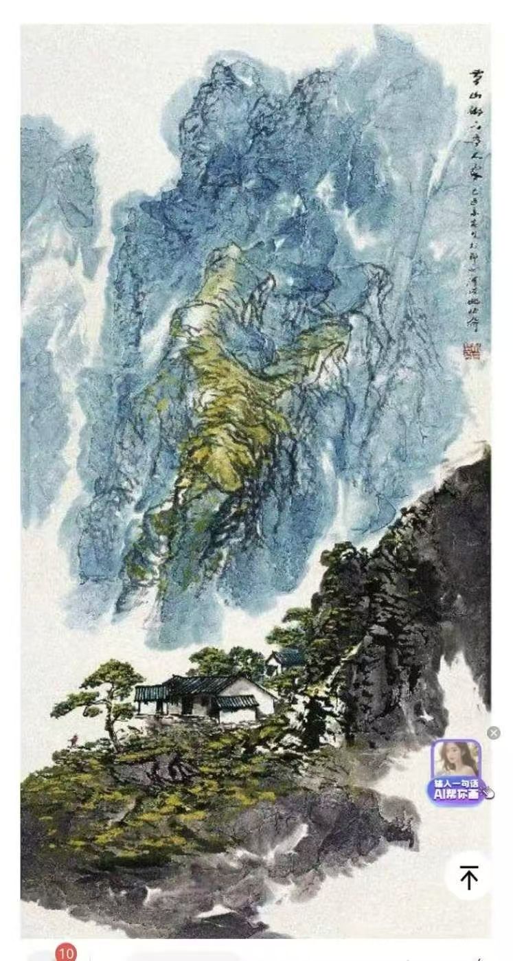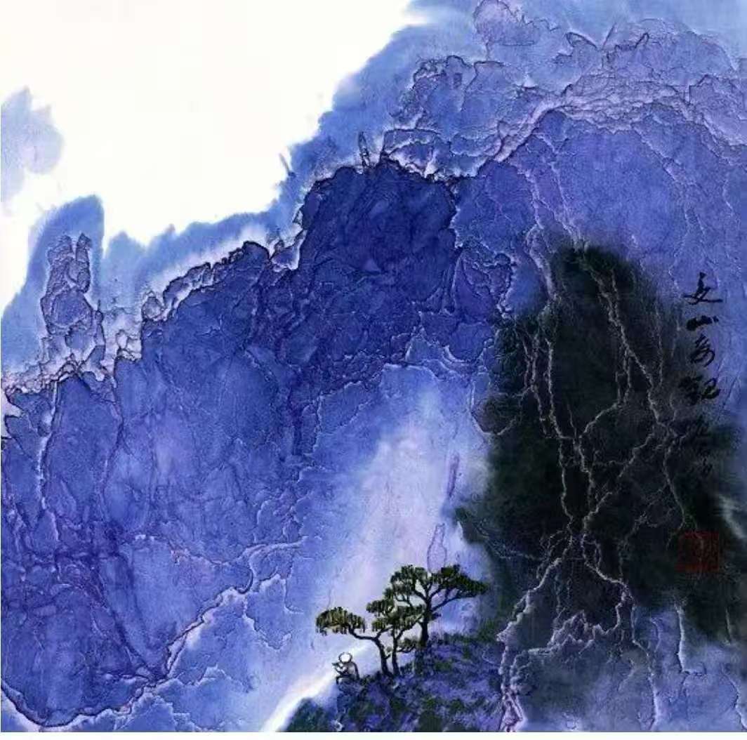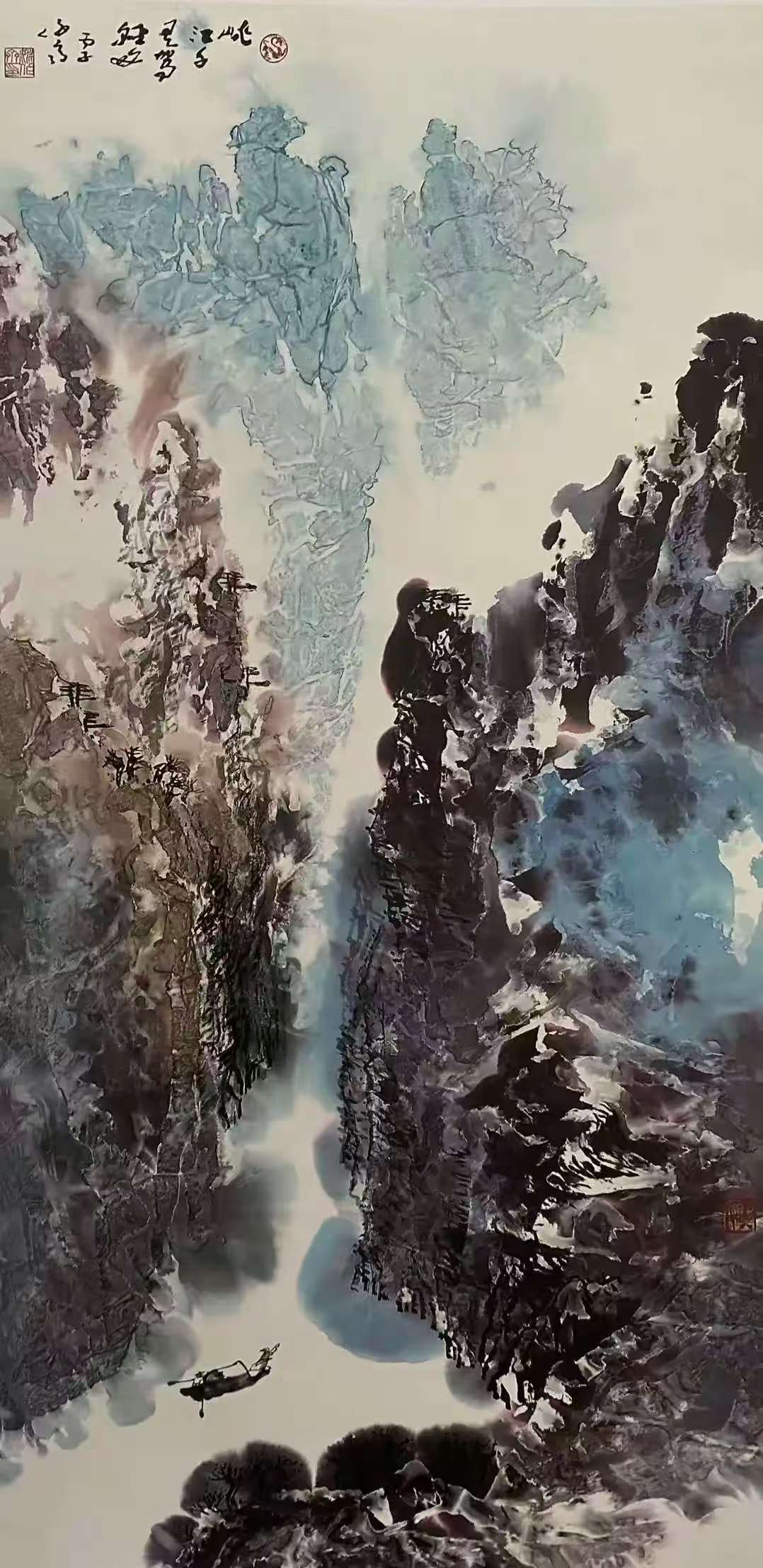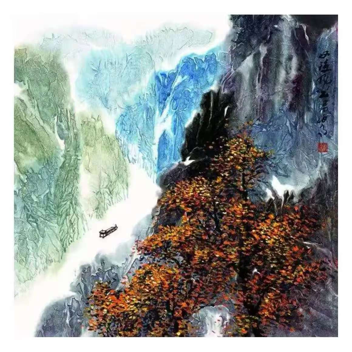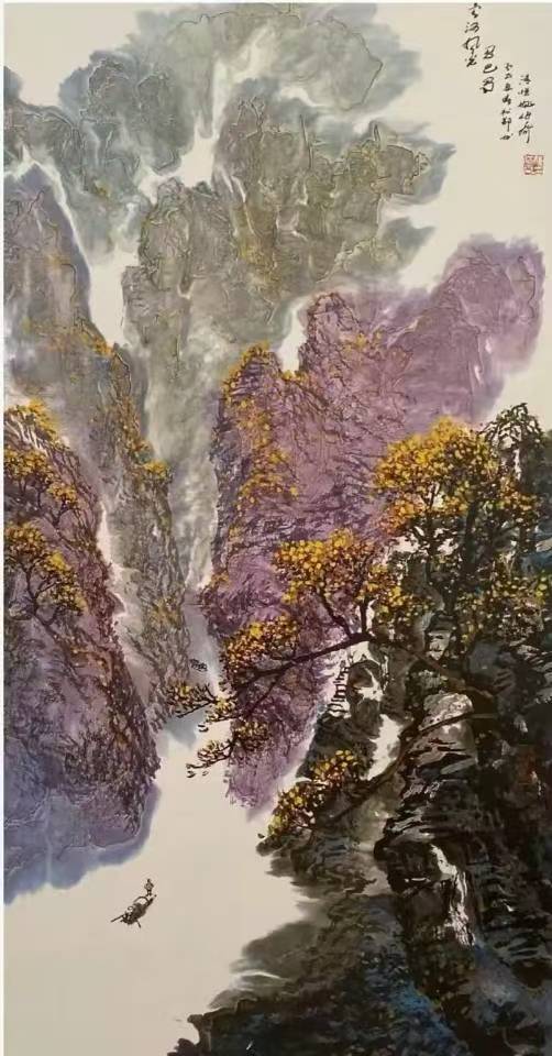 而他的泼彩作品,则宛如一首首悠扬的抒情诗,将人们带入一个如梦如幻、如诗如画的仙境。与焦墨的刚劲恢弘截然不同,泼彩山水由近观变为远望,由恢弘化作清丽,由峥嵘转为迷离。它展现的是三峡的影子,是三峡在光影交错间的柔美与灵动。那绚丽的色彩,如同天边的云霞,肆意挥洒在画布上,勾勒出一幅幅美轮美奂的画卷。红的似火,燃烧着激情与活力;蓝的如海,蕴含着深邃与神秘;绿的像翠,洋溢着生机与希望。每一幅泼彩作品,都是姚先生对三峡之美的独特诠释,是他内心深处对大自然的热爱与赞美。置身其中,我仿佛能闻到山间花草的芬芳,能听到鸟儿清脆的歌声,能感受到大自然的温柔怀抱。