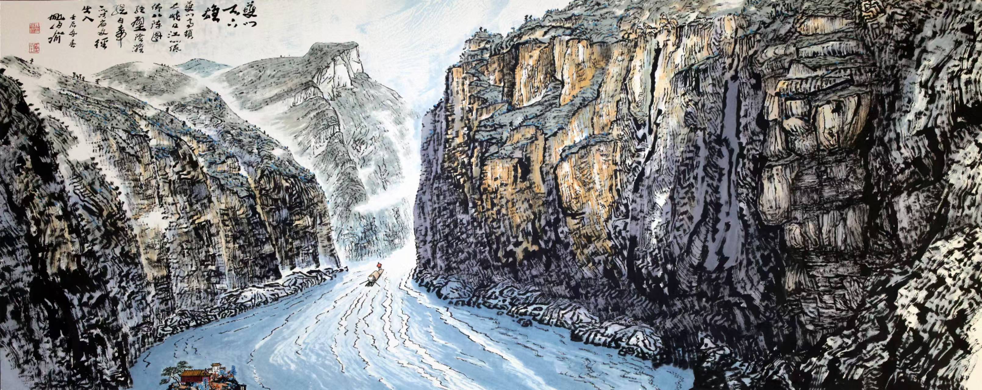 姚伯齐先生,无疑是当今画坛一颗耀眼的明星,以其对焦墨和泼彩两种绘画形式的卓越驾驭,开创出全新的中国画形式,独树一帜于艺术之林。他的焦墨作品,宛如一记记重锤,狠狠敲击着人们的心灵,带来强烈的震撼。那铿锵有力的线条,似刀削斧凿般勾勒出三峡山石的坚毅与雄浑。每一块山石,都仿佛是历史的见证者,历经岁月的洗礼,饱经风雨的侵蚀,却依然傲立天地之间。姚先生用他的画笔,赋予了这些山石灵魂与生命,让它们在画布上诉说着三峡的古老传说和壮丽史诗。站在他的焦墨作品前,我仿佛能听到三峡的波涛汹涌,能感受到山风的呼啸而过,能触摸到历史的厚重与沧桑。