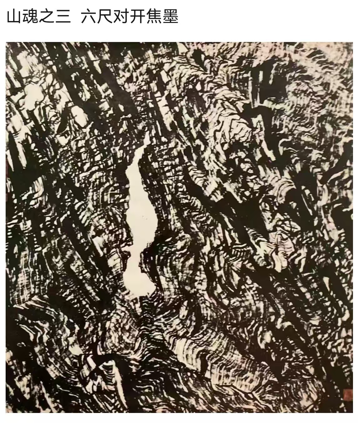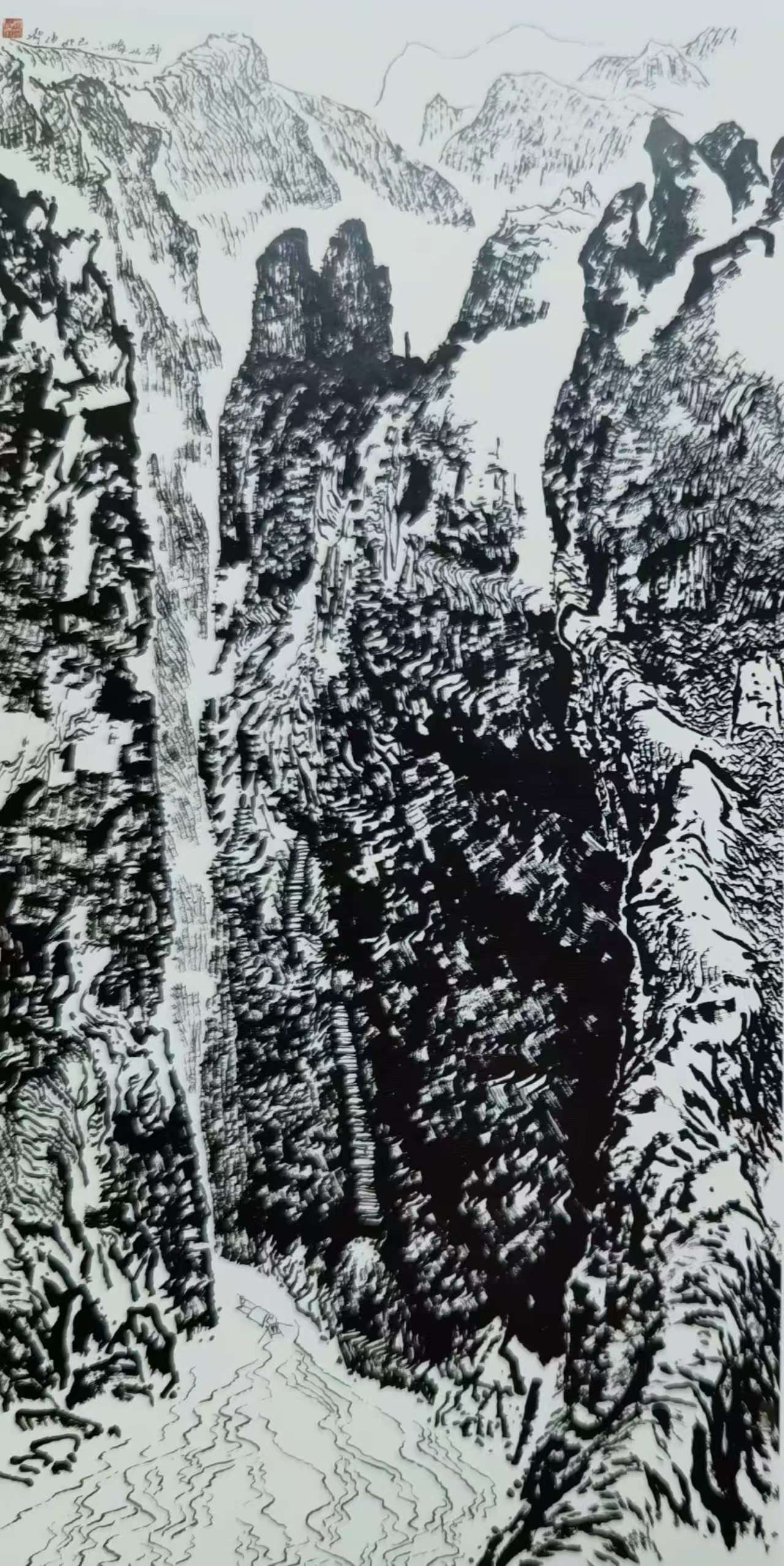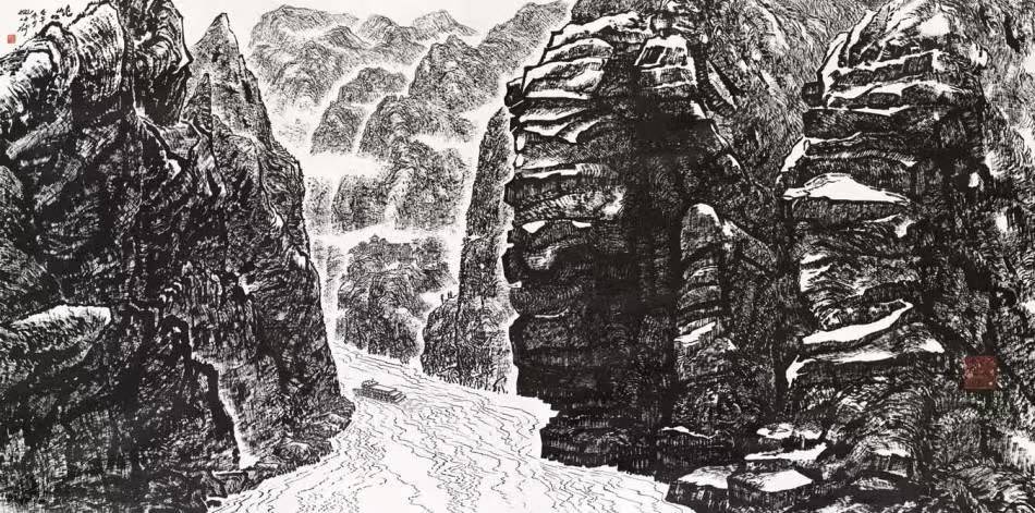 八十年代末,为画好大三峡,姚先生在尝试了各种绘画形式后,最终找到了自己艺术创作的切入点——焦墨。他踏上由张仃先生开拓出来的焦墨山水画道路,却并未满足于模仿和沿袭,而是思考如何走出一条属于自己的独特艺术之路。在多年反复去三峡写生的过程中,他如同一位敏锐的观察者,仔细观察三峡那些构造独特的山体形态和山石表面的肌理纹样。他发现,传统的皴法已无法完全表现出三峡山石的独特魅力,于是他开始大胆创新,慢慢摸索出将勾皴巧妙搭配,通过线面结合,在传统皴法的基础上把线条加以扭曲变化,同时强化线条的力度。这种独特的画法,就像一把神奇的钥匙,打开了他艺术创作的新大门,使他能够将长江三峡壮美的自然景象描绘成他心目中的另一种真实的意象。完成后的图画,正是他要表达的那种令他魂牵梦绕的美好三峡,其视觉冲击力是其它画法所不可比拟的。站在他的作品前,我仿佛能感受到三峡的山石在身边真实地屹立,能听到它们在岁月的长河中发出的低沉诉说,能触摸到它们那历经沧桑的纹理。