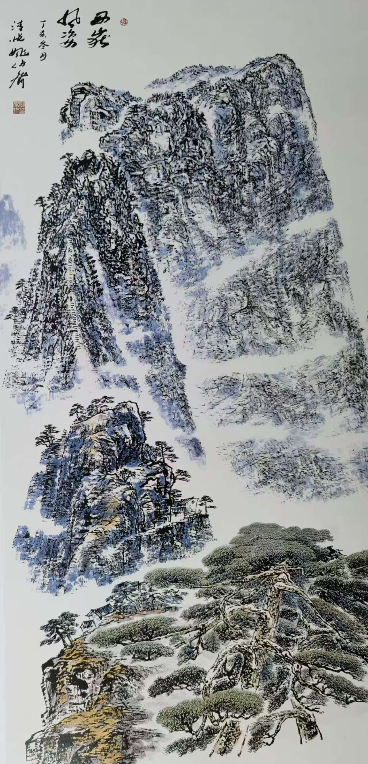姚先生对书法的热爱与钻研,也为他的绘画艺术增添了独特的魅力。他深知书法与绘画同源异流,相互影响,相互促进。于是,他苦练书法,从书法中汲取灵感,用以书入画的方法,创作出许多独具特色的焦墨画。他将折带皴和斧劈皴合二为一,形成一种新的勾皴画法,进一步丰富和完善了自己的焦墨山水技法,形成了自己独有的个人艺术语言和姚氏图式。他的作品中,线条流畅自如,变化万千,时而如蜿蜒的溪流,时而如奔腾的骏马,时而如飘逸的丝带。这些线条,不仅仅是画面的构成元素,更是他情感的表达载体,是他内心世界的真实写照。