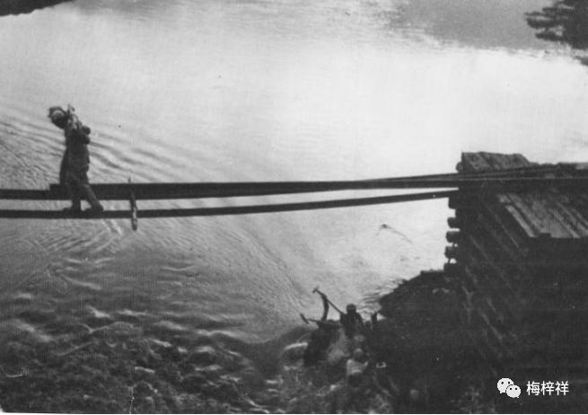 1948年11月,战斗在沈吉线上的铁道纵队第4支队,仅用15天,就修复了断续破坏的35公里线路和9座桥梁。图为战士们冒着危险,踏着悬空的单轨抬运钢轨抢修“118”大桥。