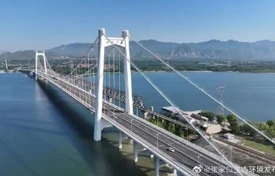 “这是怀来大桥。建于2015年10月至2021年6月 ,是北京冬奥会的工程项目,全长1988米,跨越我国第一个大型水库—官厅水库水域,堪称“华北第一跨”。(见下图)