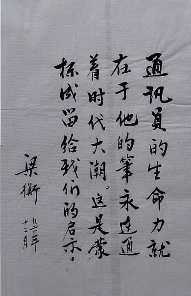 蒙标成和我同年参军,我们都是扛过枪的战友。我现在担负的工作和蒙标成生前一样,我们的人生经历也惊人地相似,只是他比我更苦、更不幸。然而,他短暂的一生是奋斗的一生,他把自己的全部精力乃至整个生命都献给了他深深挚爱和苦苦追求的新闻事业。在生命的最后岁月里,他一手打着吊针,另一只手还捧读着他心爱的《通讯员之路》一书及有关报刊……