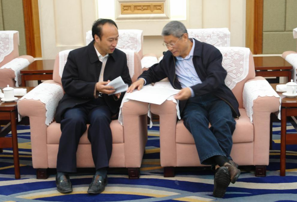 李佩山(左)和国家新闻出版署原副署长、时任《人民日报》社副总编辑梁衡再谈蒙标成等宣传事宜
