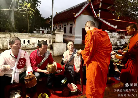 不多时,一列橙色衣着、挎着锡钵、年纪不一的僧侣从街的尽头缓缓走来。他们年长的面容静穆,如古井深潭;年轻的眉眼间还残存着一丝稚气与好奇。赤足的脚步,踏在微凉的石板路上,寂然无声。跪于路边的信徒们将一簇簇新蒸的糯米饭虔诚地放入僧侣们的锡钵中。整个过程中只有竹篓开合的窸窣与脚步移动微弱的沙沙声,构成一种奇特的、流动的静谧。