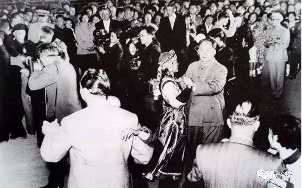 毛主席披者银灰色的大衣,迈着矫健的步伐,进入顾年堂,大家迎上前去请他跳舞,他兴致勃勃地跳了起来。