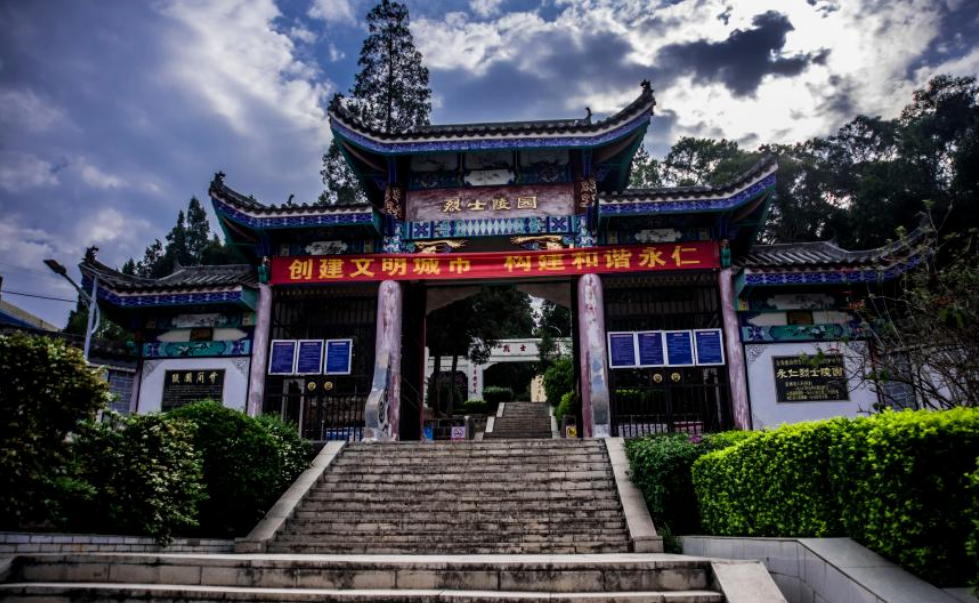 祭扫的最后一站是永仁烈士陵园,烈士陵园位于城东先峰营山上,这里可以俯瞰全城。该陵园是云南省唯一一座省级烈士陵园,占地近两万平方米。1969年为纪念修筑成昆铁路英勇献身的烈士而兴建,1970年11月落成。拾级而上,正门上方的“烈士陵园”四个大字庄严肃穆。高18米的烈士塔巍然屹立在园内。塔两侧有喷水池及八角亭和碑记,左边碑记建园始由,右边碑刻八七00副部队长李永增(铁七师副师长)等烈士名单,塔两侧新增了社会主义建设各个时期的典型雕塑,其中成昆铁路的浮雕画面十分醒目。塔后为整齐规整的六排墓地,依然像当年出征的军阵。