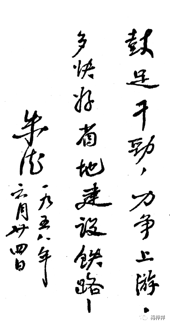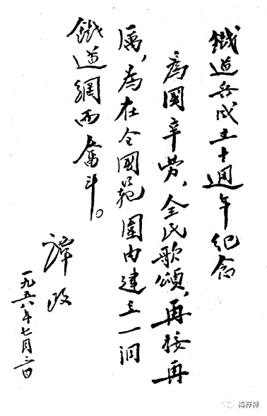 7月3日,大将,总政治部主任谭政题词。谭政,毛主席说他是“邻居”(都是湘潭人),两人是小学同学,井冈山时期担任毛主席秘书,10名大将中唯一以政工业绩突出而授此殊荣者。作为军队政治机关的最高领导,讲话、写文章,白纸黑字在纸上,都是很“谨慎”的。他的题词说铁道兵“全民歌颂”,铁道兵能不干劲倍增?题词全文:“为国辛劳, 全民歌颂,再接再励,为在全国范围内建立一个铁路网而奋斗!”