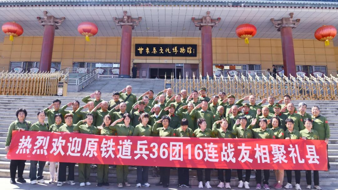 在素有秦皇祖邑之称的甘肃省秦文化博物馆,远道而来的16连战友们还亲切会见了分别近半个世纪的礼县籍原排副长张西彦、老班长张西维和回族战友吴龙。这3位退役老兵为表达心意,他们从离县城一百多里的乡下赶进县城,在秦人广场上拉起“热烈欢迎参加陇上行的铁道兵老战友莅临礼县”的横幅,营造喜庆热烈的气氛。吴龙战友还特意从盐官镇定制了具有民族特色的纯手工油煎馓子和麻花,给60多位战友每人馈赠一份。以此表示他们全家人对战友的亲切慰问和衷心祝福。原连长徐龙田还代表全连指战员,给这3位老战友补发了印有“原铁道兵36团16连战友陇上行留念”的军用T恤衫。