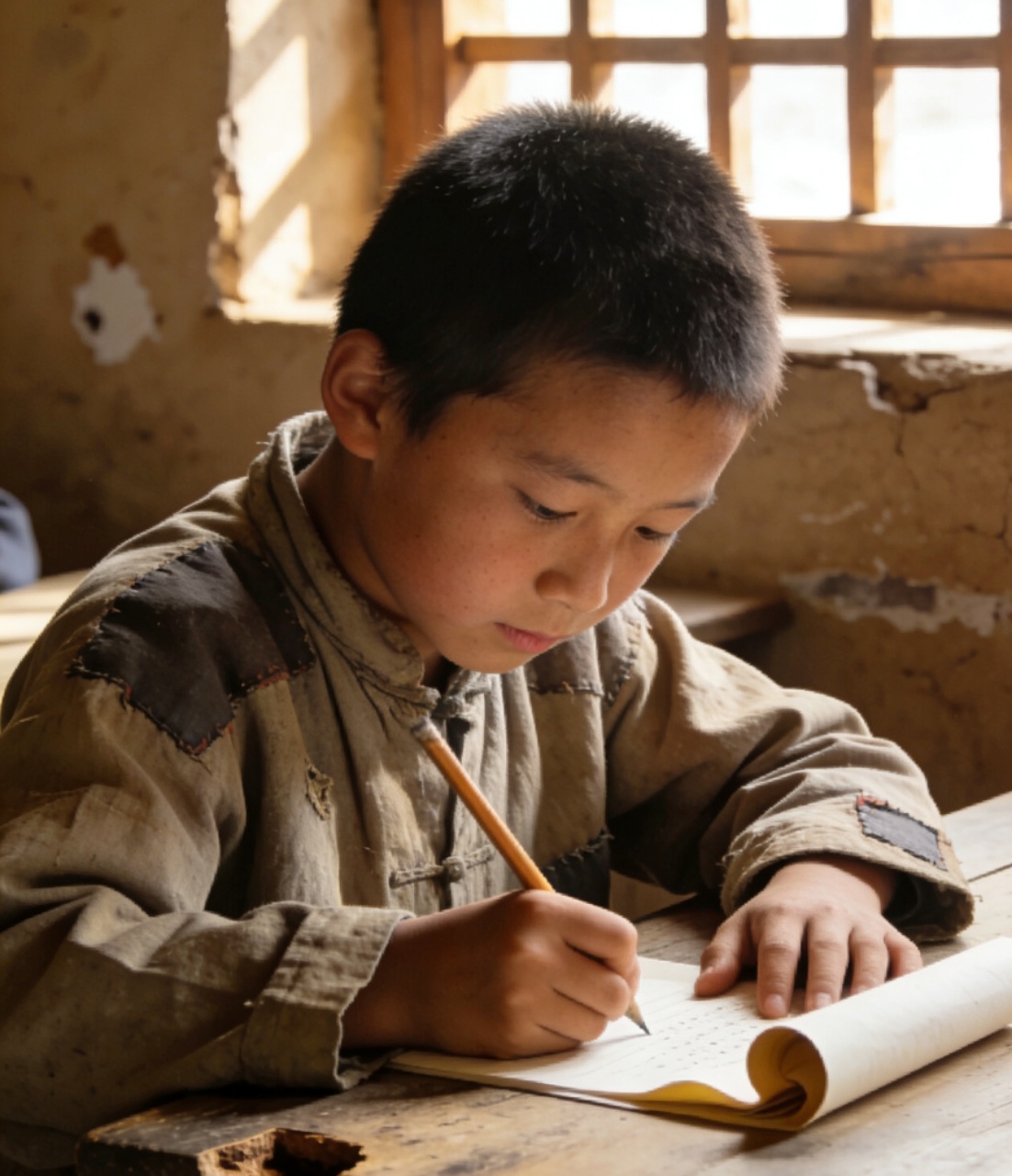 八岁那年,我才踩着晨雾与露水,走进大队旁边那所简陋得不能再简陋的小学。泥巴垒的墙,木梁窗,几张缺腿的桌子歪歪斜斜地立在地上,黑板被岁月磨得发白,写上去的字,隔远了便模糊不清。我没有读过一年级,直接从二年级下学期开始念起,一生都没摸过拼音课本,不识“波坡摸佛”,不懂四声平仄,别人张口就能拼读的音节,于我而言,是一道跨不过去的门槛。可我从不敢抱怨,更不敢放弃,山里的孩子最明白,能坐在教室里,握着父亲用竹杆自制的毛笔,在粗糙的本子上写下自己的名字,已是天大的福气。每一个字,我都一笔一画刻在心上,像在坚硬的山石上凿刻希望,凿一下,深一分,凿一下,亮一分。