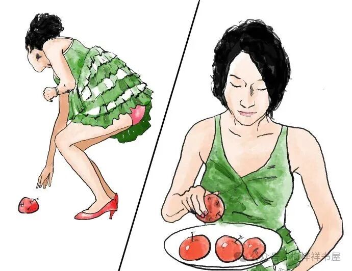 那天果盘里是苹果和圣女果。一位面容姣好的少妇打菜时,伸手在苹果堆里挑拣,指尖刚碰到一枚,苹果就滚落到地上,弹了两下才停下。她弯腰去追,秋日常见的厚衣裹着她,唯独裙摆轻盈,我坐在一旁,恰好瞥见她裙下浅色碎花的短裤。