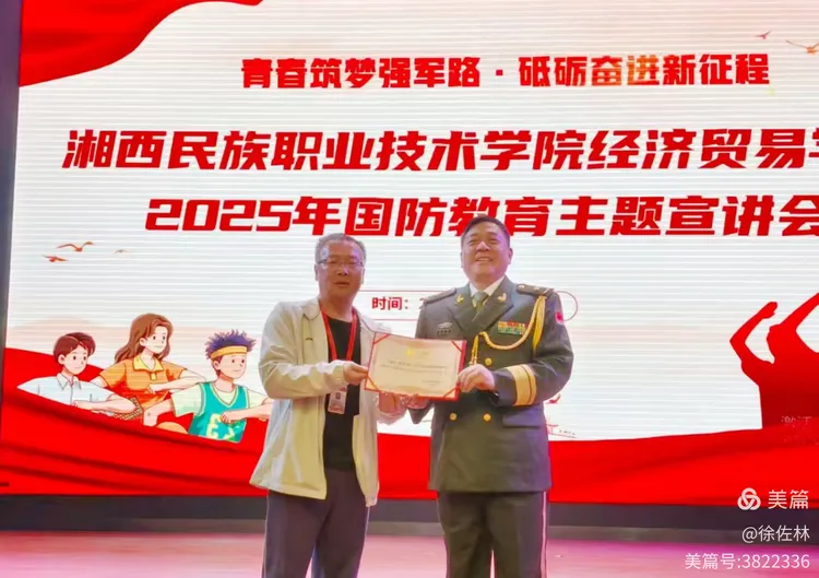“国防教育是我多年来始终如一的宣讲主题。”徐佐林教授深情表示。作为“湖南省国防教育讲师团专家”,他常年奔走于大中小学讲台,用脚步丈量责任,以声音传递信念。如今,再次受聘于湘西职院,对他而言不仅是荣誉,更是使命的延续。仅今年一年,他已开展国防教育宣讲五六十场,每一次登台,都是对初心的坚守,对未来的播种。