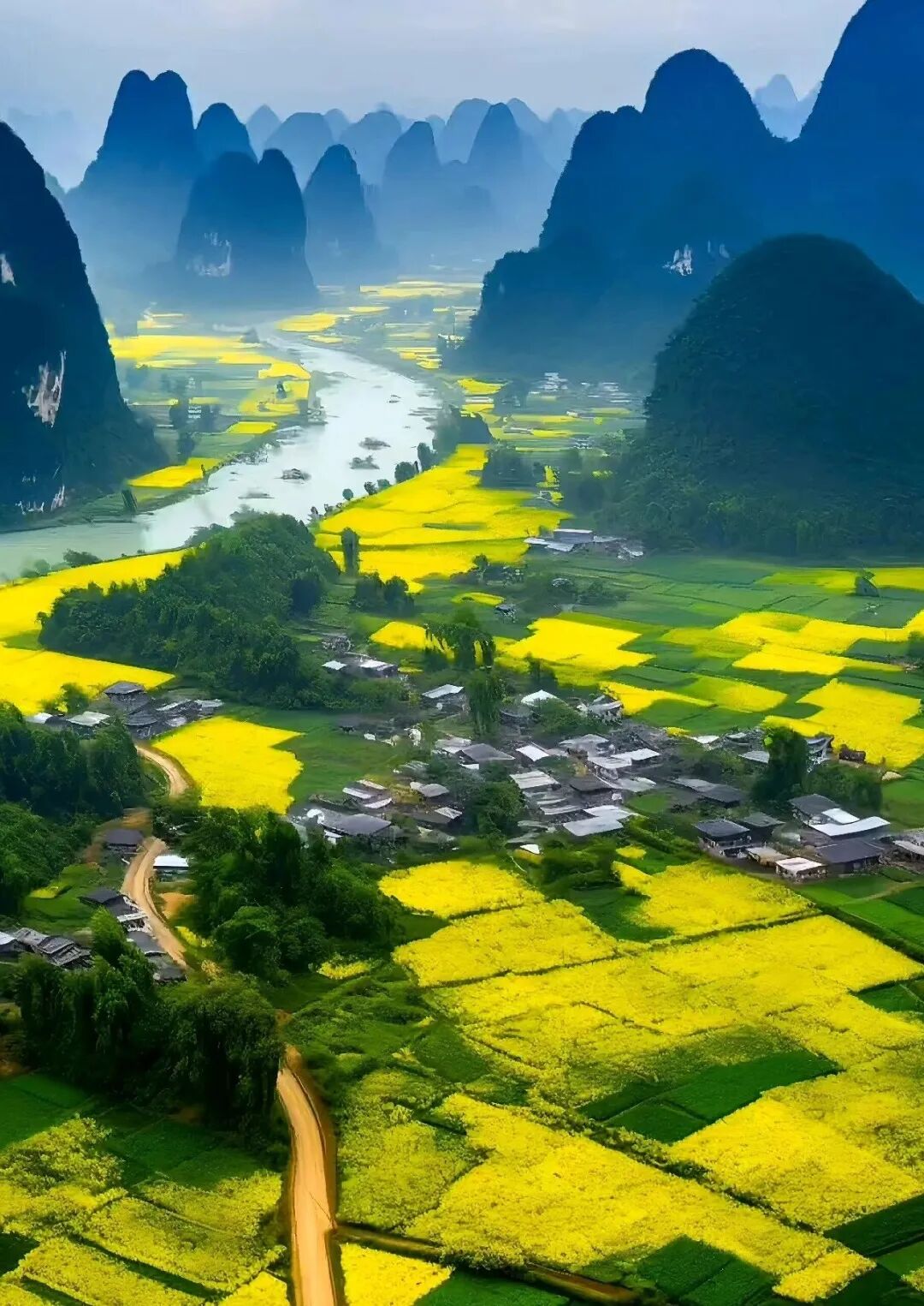 桂林的春,是山水相依的空灵。漓江碧波荡漾,两岸峰林披上新绿,晨雾缭绕间,竹筏轻泛,渔翁撒网,勾勒出“舟行碧波上,人在画中游”的绝美意境;阳朔遇龙河的油菜花海与碧水相映,金黄的花浪随风起伏,蜜蜂蝴蝶穿梭其间,游客骑着单车穿行花海,听流水潺潺、鸟鸣啾啾;龙脊梯田春水灌满,如镜面般倒映着蓝天白云,壮族村民扶犁春耕,古老的农耕文明在春日里延续,诉说着“天人合一”的生存智慧。