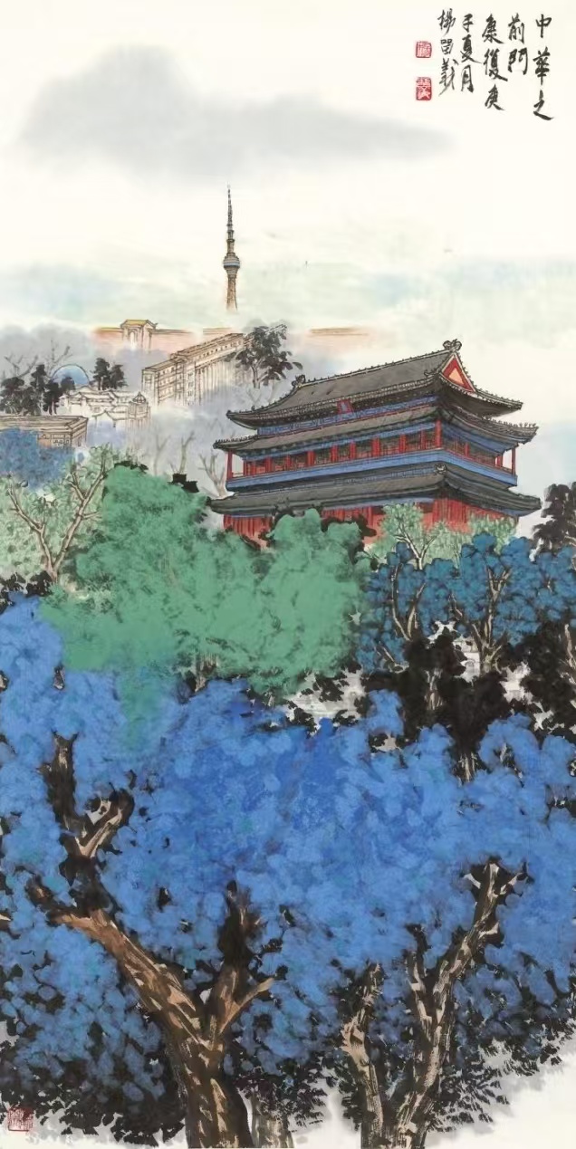 /杨留义 城市山水画《北京中轴线永定门》136x68cm/