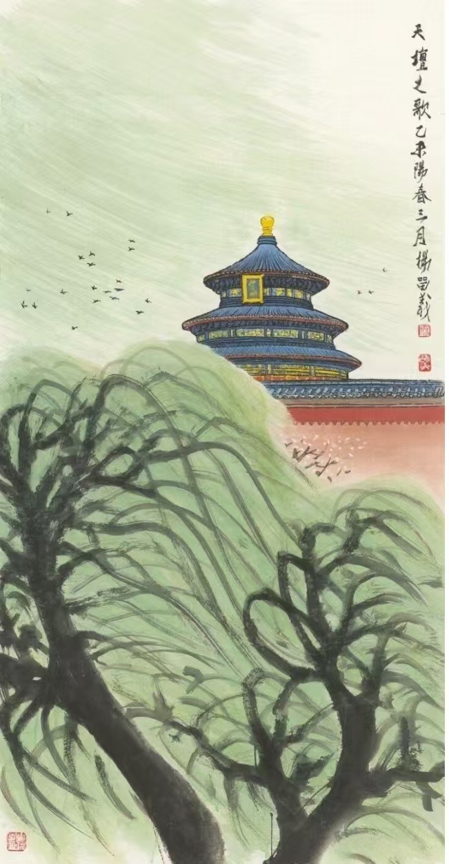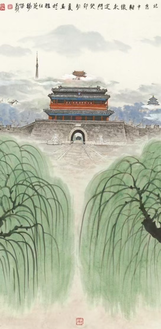 北京城市山水画研究会会长杨留义深耕艺坛多年,始终致力于探索城市文脉的艺术化表达。展览精心呈现了他以北京中轴线15处核心遗产要素及周边重要历史文化景观为主题创作的城市山水画作品。他以其独树一帜的艺术视角和精湛的笔墨技法,将巍峨的宫殿群、庄严的礼仪空间、古朴的坛庙建筑以及市井烟火气,巧妙地融汇于丹青画卷之中。