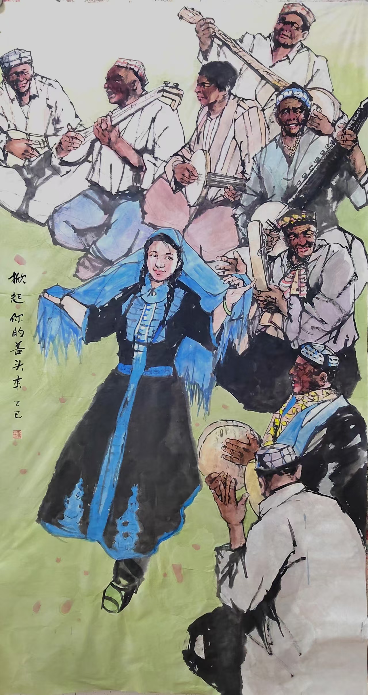 水墨画《舞动的锅庄》180cmx63cm 2025