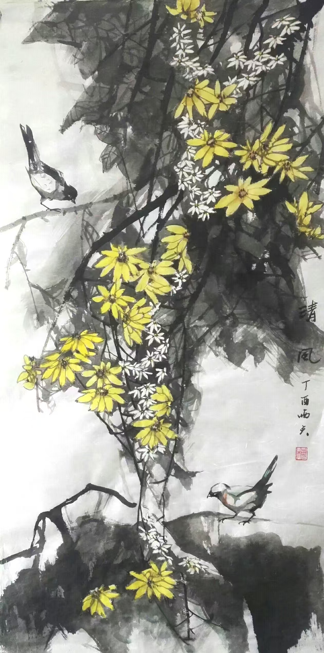 水墨画《处处闻啼鸟》136cmx63cm 2025