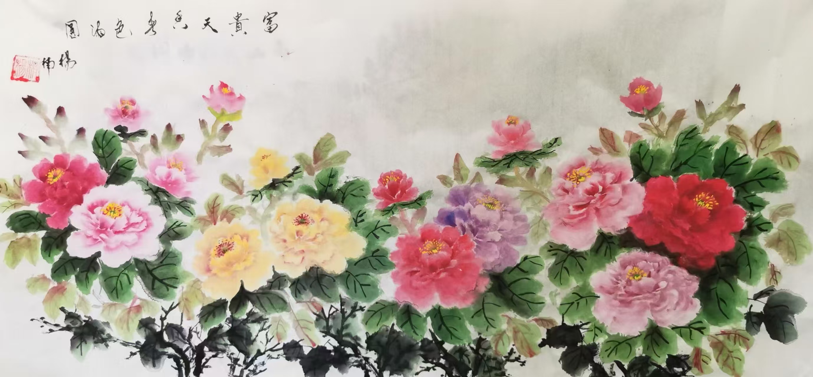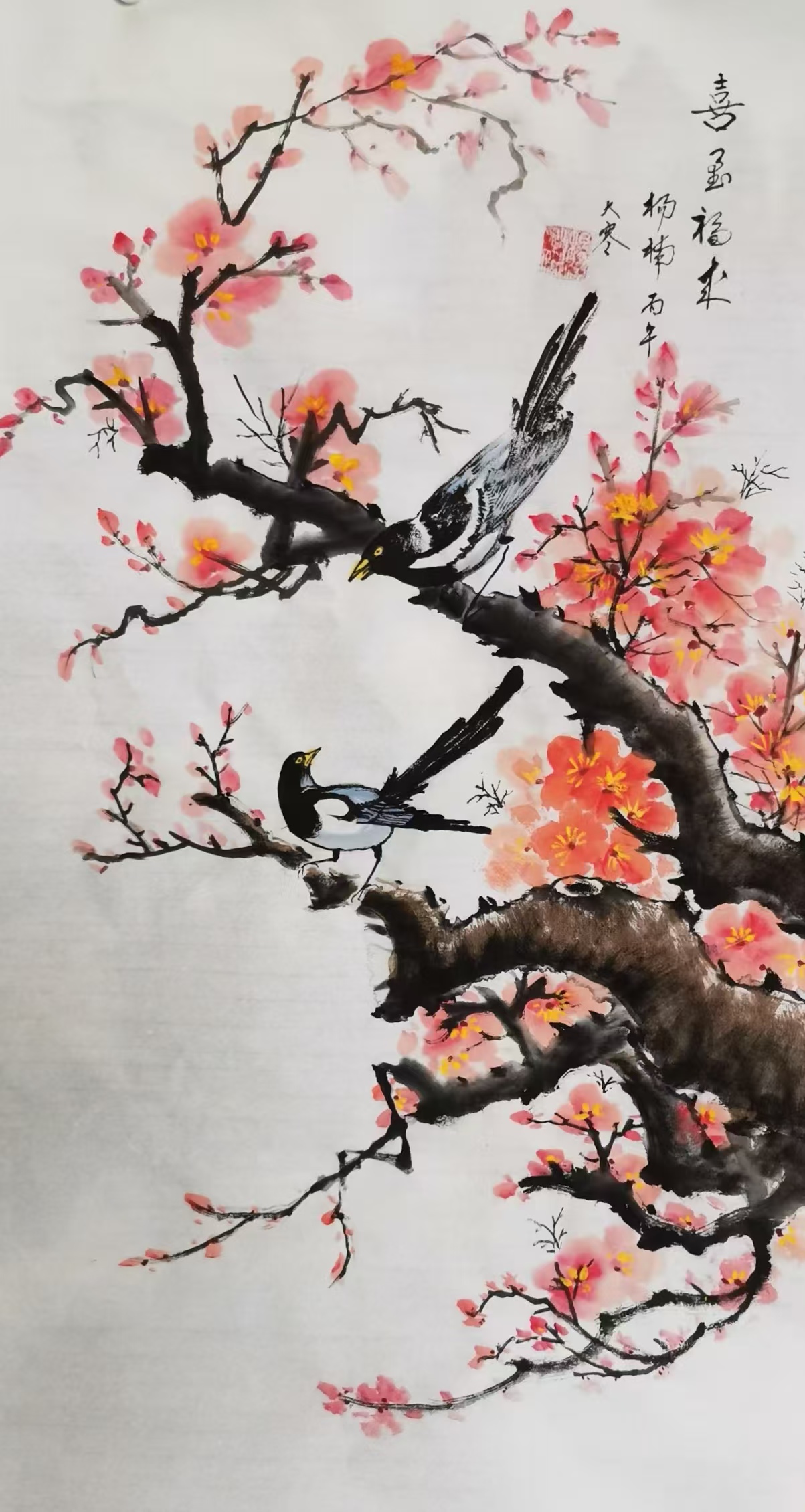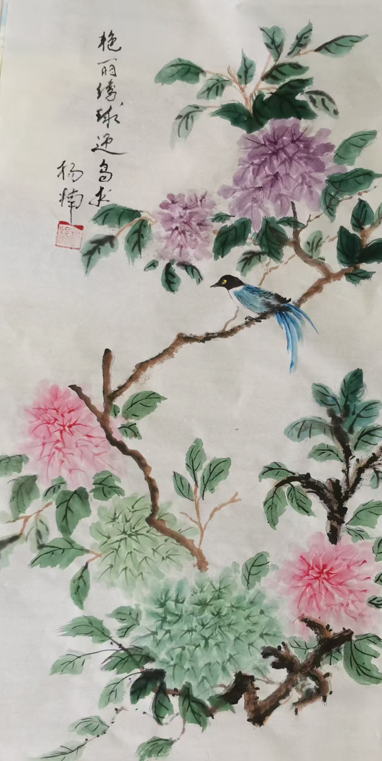 国画《艳丽绣球迎鸟来》100cmX50cm