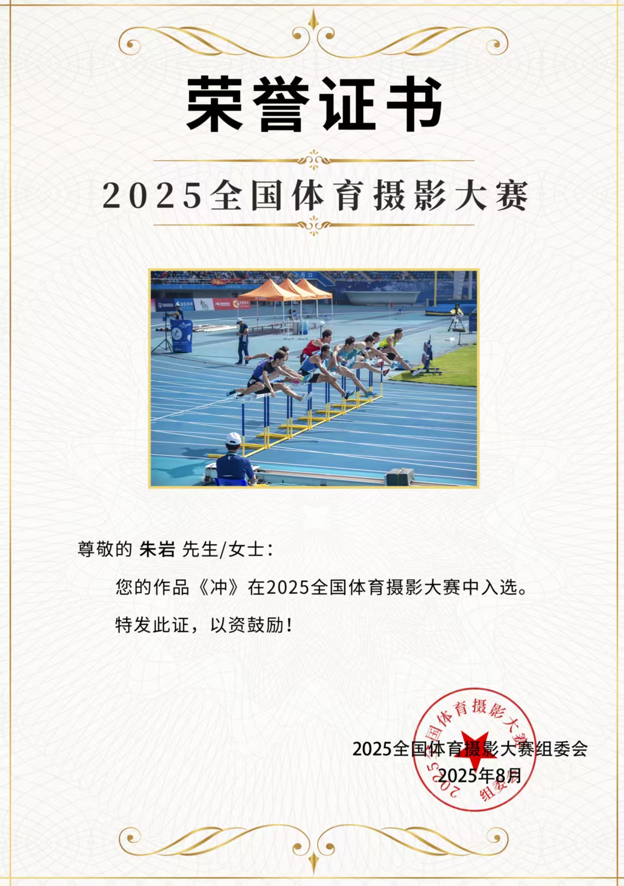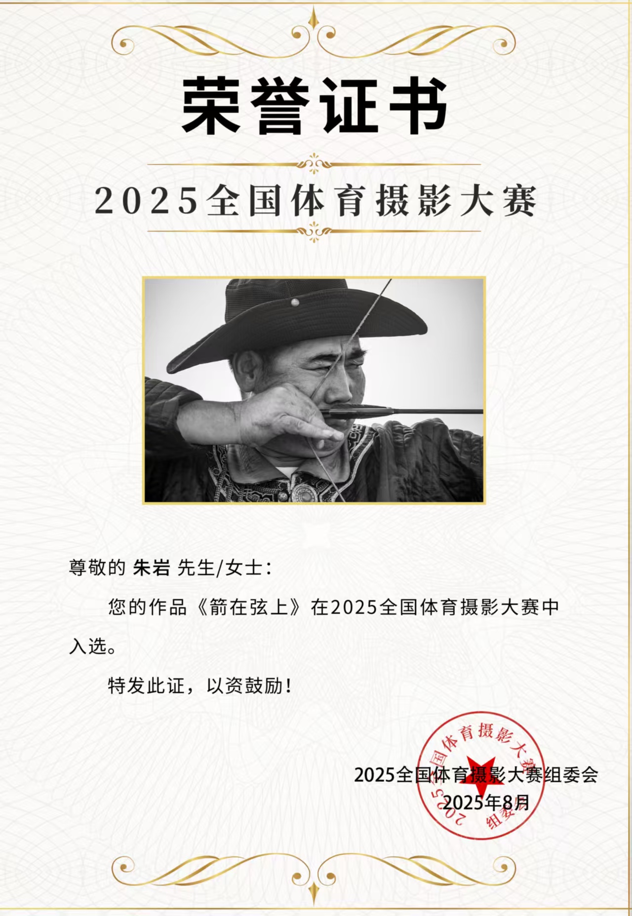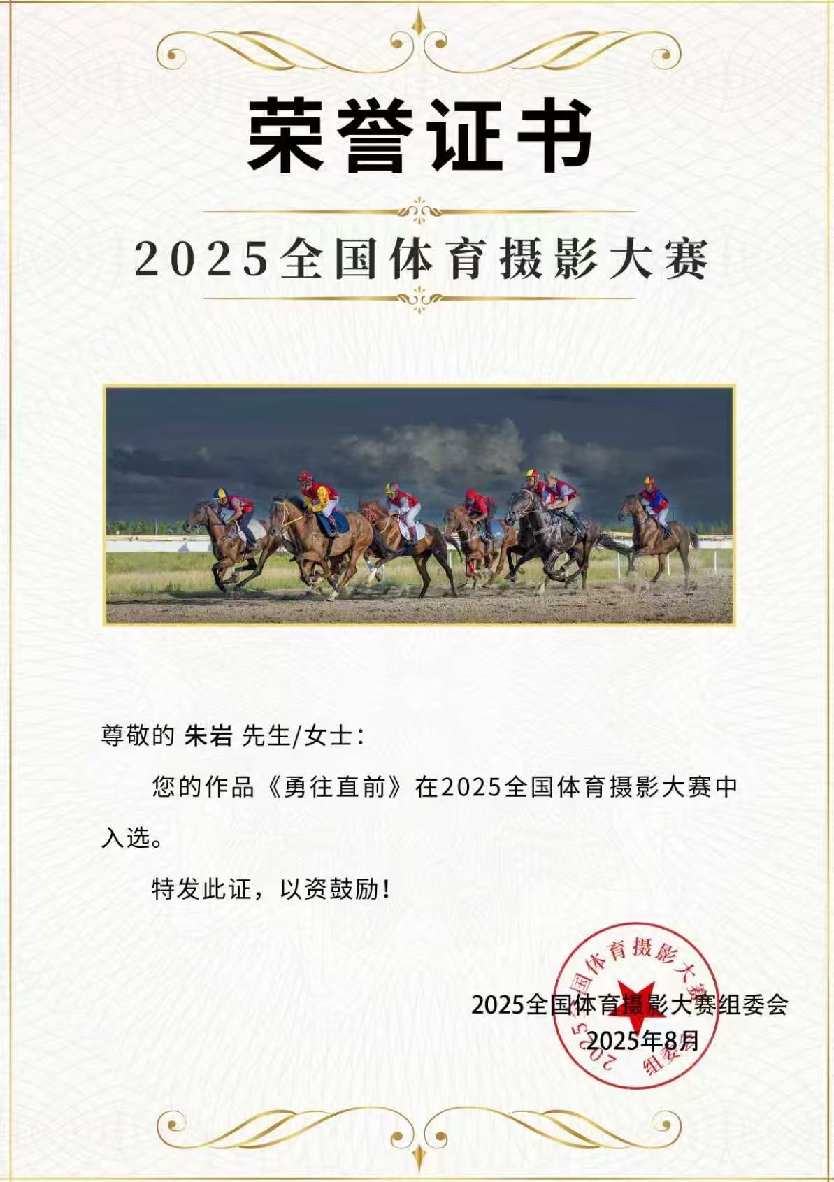 朱岩8幅(组)摄影作品入选《2025全国体育摄影大赛》,并受邀参加由中国摄影家协会与浙江省丽水市人民政府联合主办的2025国际摄影节,入展由国内著名摄影机构“尚图坊”承办的“光影运动,定格精彩”体育摄影展览版块,因为要交制作费,作者放弃参加。
