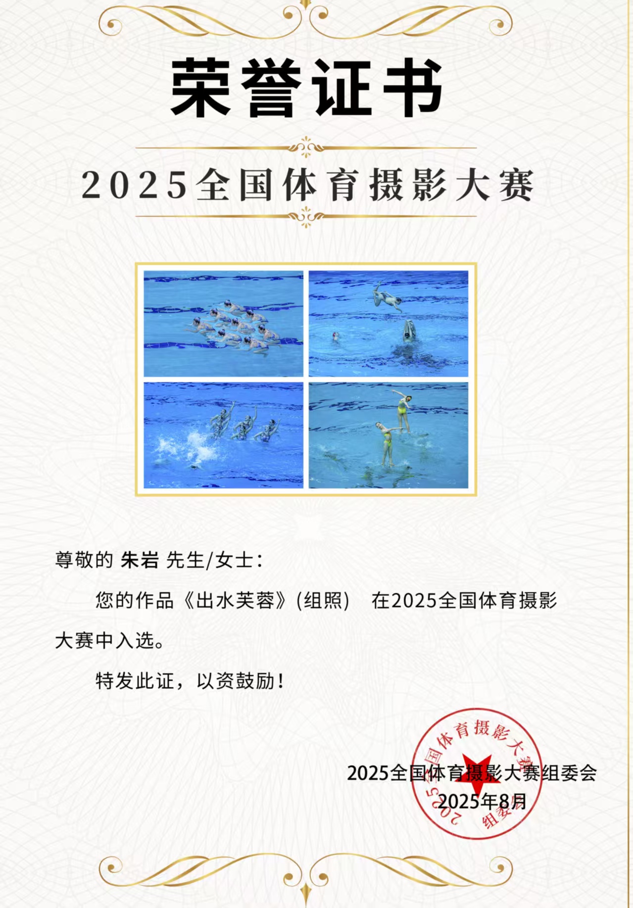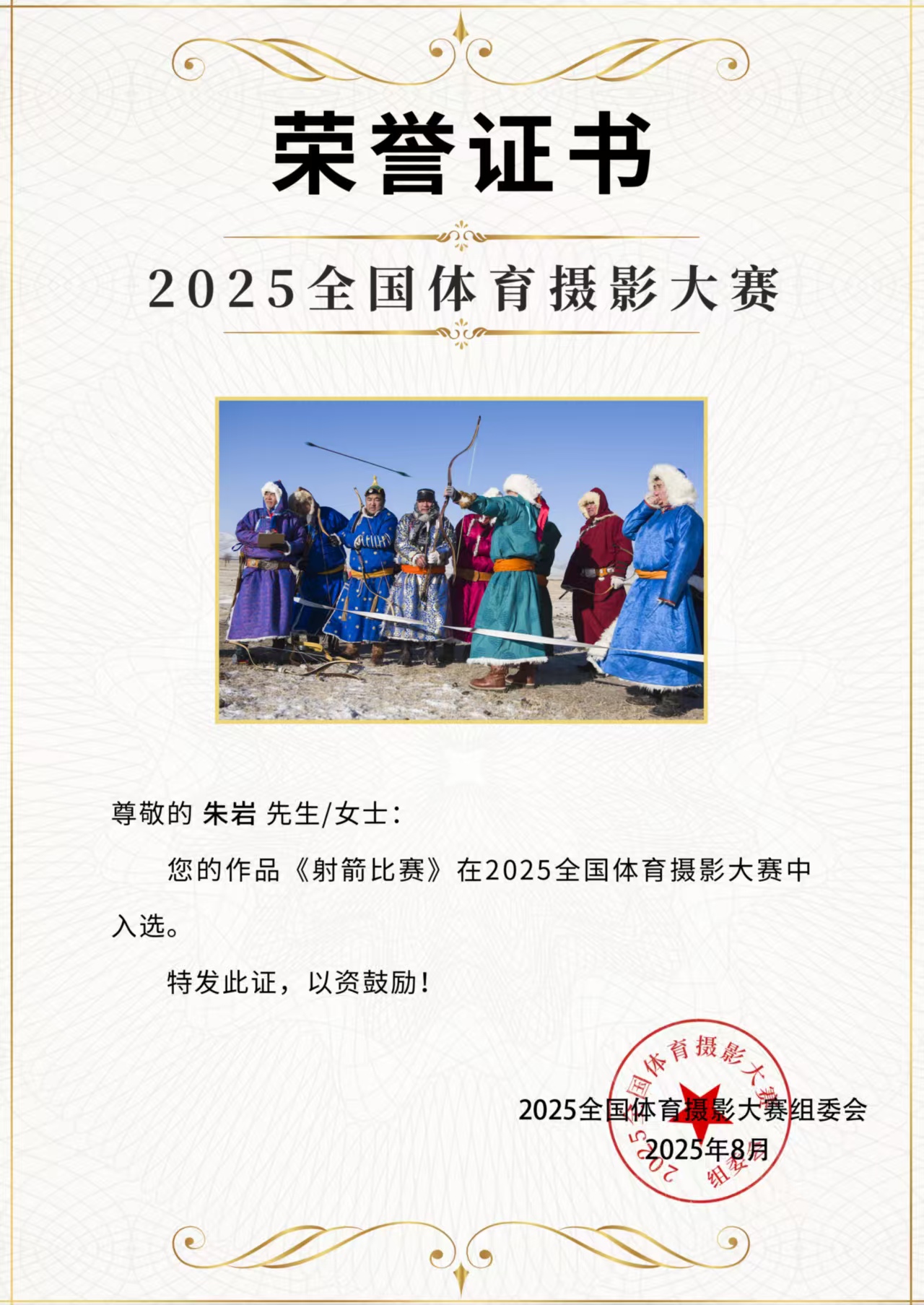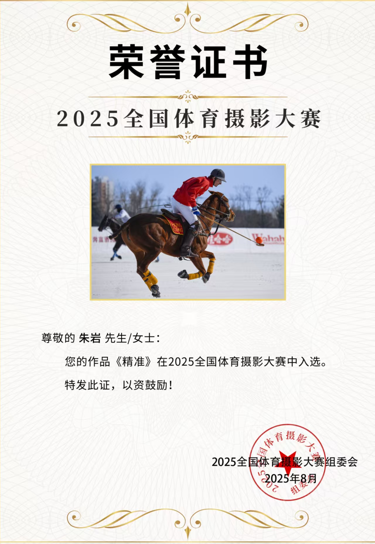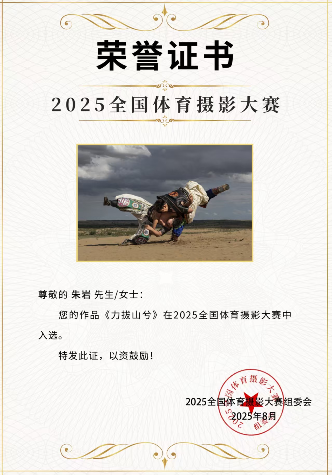 朱岩8幅(组)摄影作品入选《2025全国体育摄影大赛》,并受邀参加由中国摄影家协会与浙江省丽水市人民政府联合主办的2025国际摄影节,入展由国内著名摄影机构“尚图坊”承办的“光影运动,定格精彩”体育摄影展览版块,因为要交制作费,作者放弃参加。