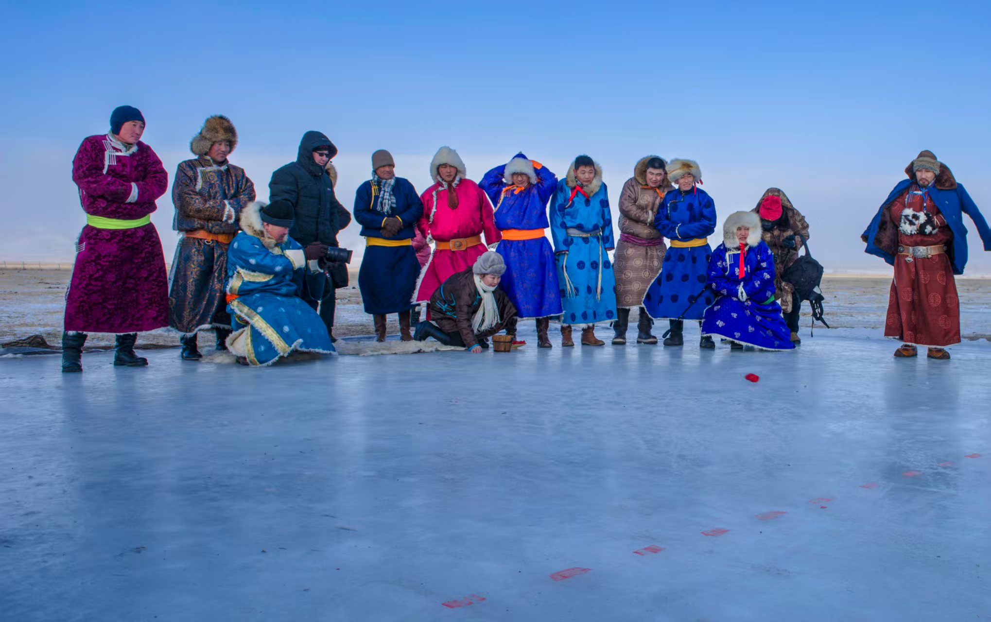 《冰嘎比赛》 2017年12月摄于内蒙锡林郭勒正蓝旗 冰嘎比赛是内蒙古冬季那达慕传统的体育比赛项目,牧民用牛拐骨在冰上滑行击打20米外对面的目标,击倒为胜。